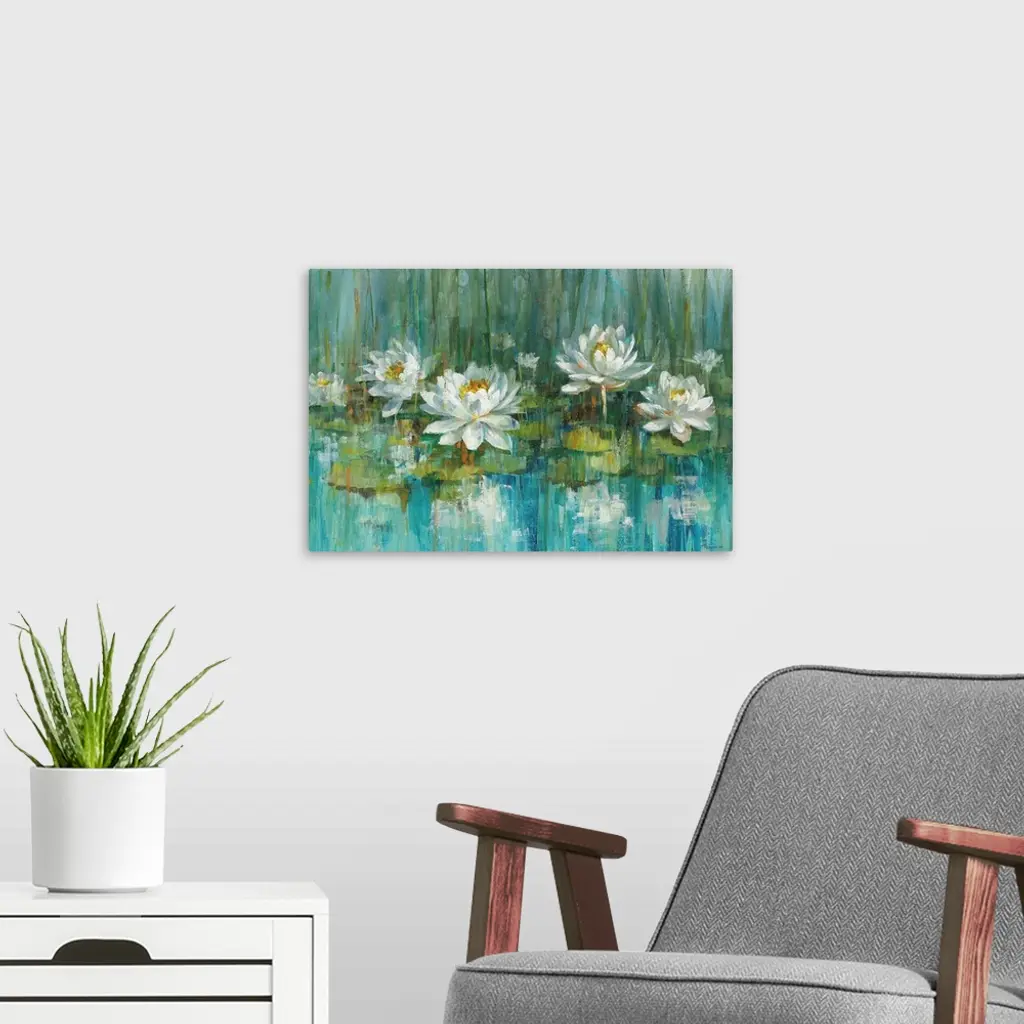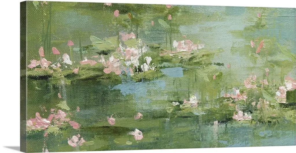 Contemporary abstract painting of water lilies in a pond with beautiful blue and green hues.