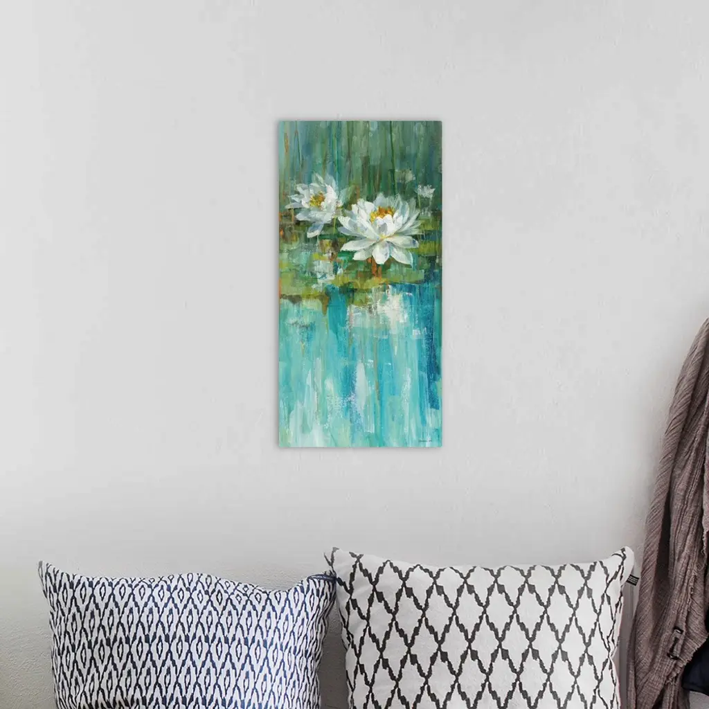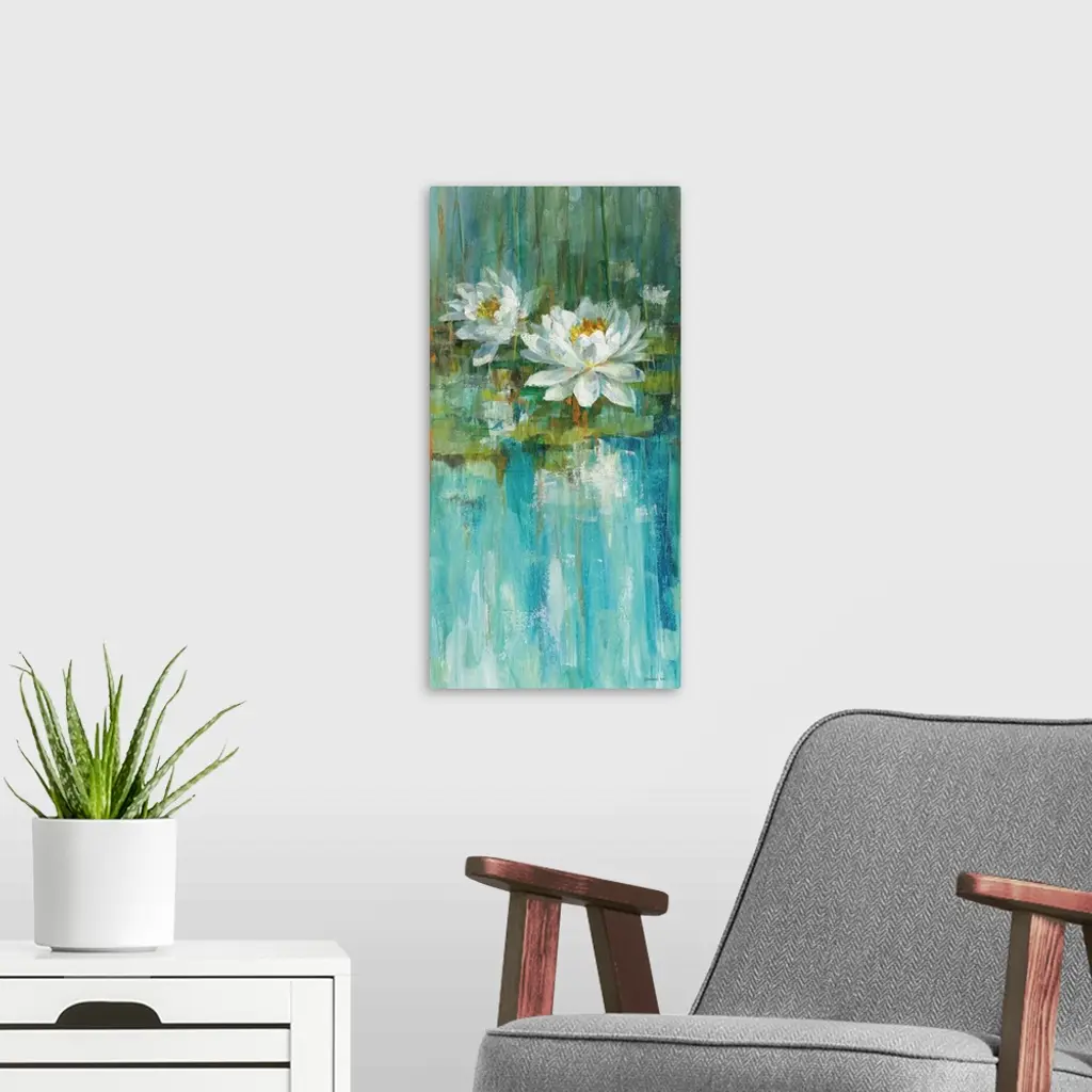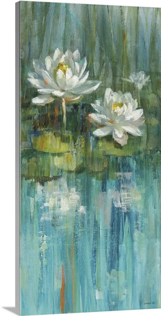 Vertical contemporary abstract painting of white lilies on green lily pads in a blue pond.