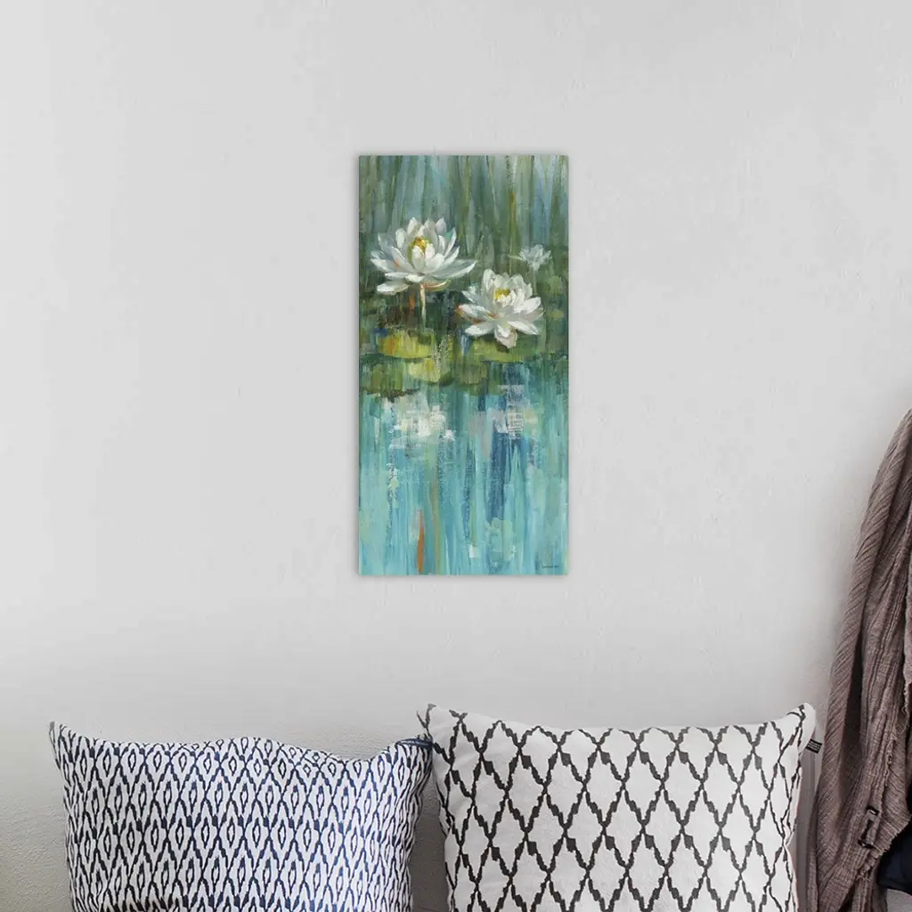 Vertical contemporary abstract painting of white lilies on green lily pads in a blue pond.