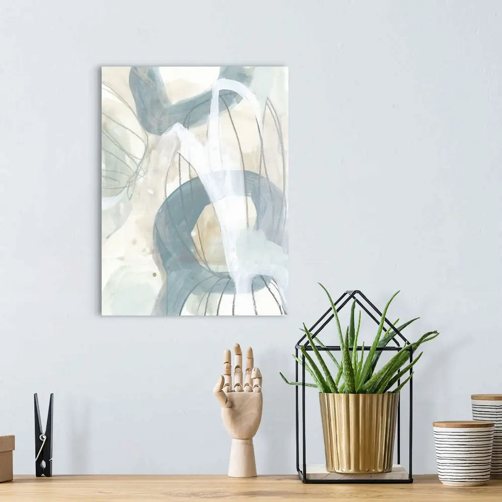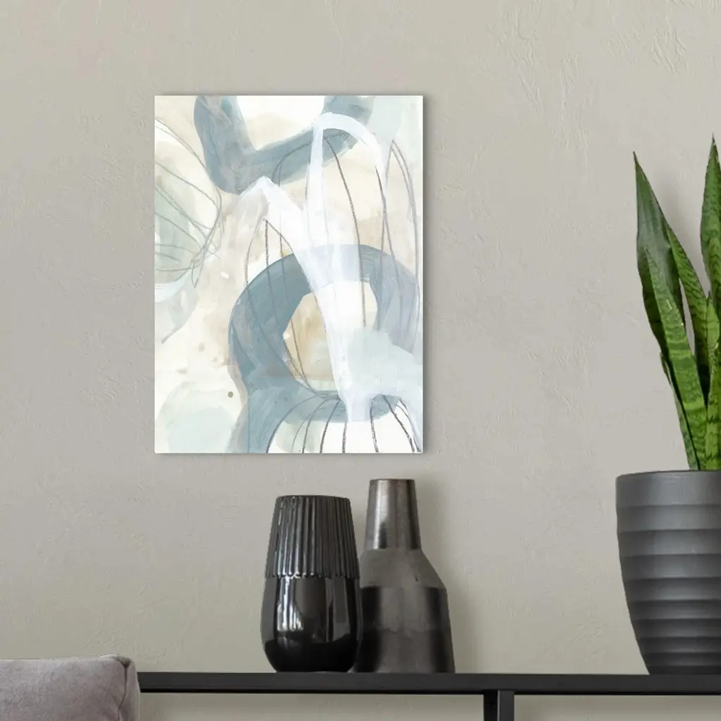 Contemporary abstract painting of interlocking circular shapes in pastel hues.