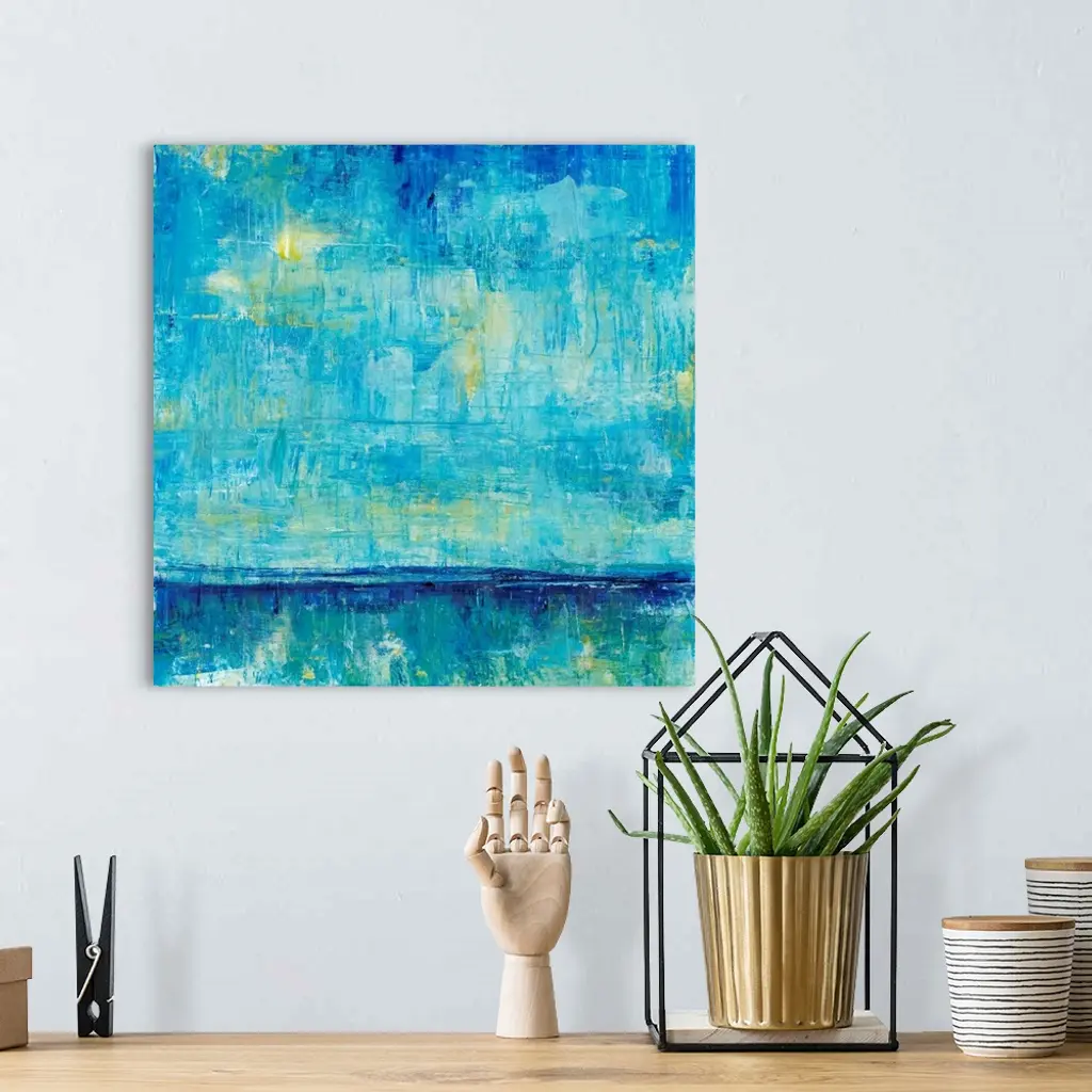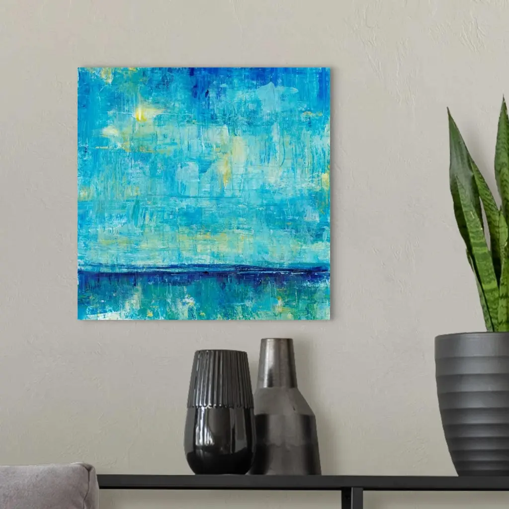 Abstract artwork of an ocean horizon in shades of teal and gold.