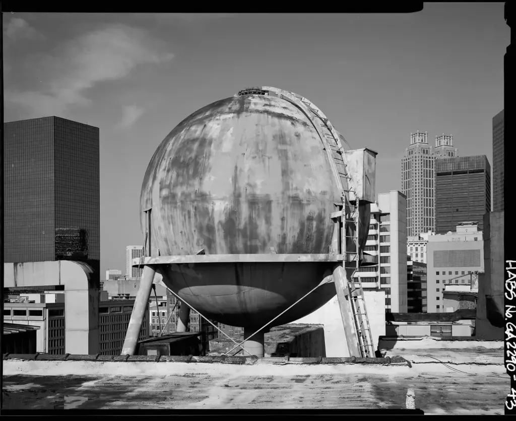 View of water tower for sprinkler system on roof of 1924 store, from southeast looking northwest. Rich's Downtown Department Store, 45 Broad Street, Atlanta, Fulton, GA. Other Title: Rich's Downtown. Photograph by Jennifer Almand.Significance: The original 1924 building, which has been added to eight times, reflects the appearance of an Italian palazzo, a favorite theme associated with department stores constructed in the early twentieth century. The 1946/1948 Store for Homes addition is one of Atlanta's earliest examples of International Style architecture. The Rich's complex is eligible for listing on the National Register of Historic Places. Rich's is significant as the focus of retail shopping in downtown Atlanta since the store's opening in 1924, and as the location from which Civil Rights leader Martin Luther King, Jr. was arrested following a sit-in as Rich's Magnolia Room restaurant, leading to his first night ever spent in jail.