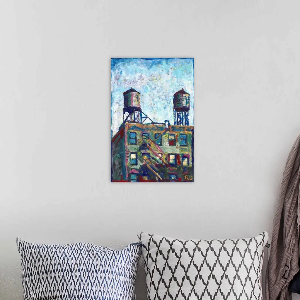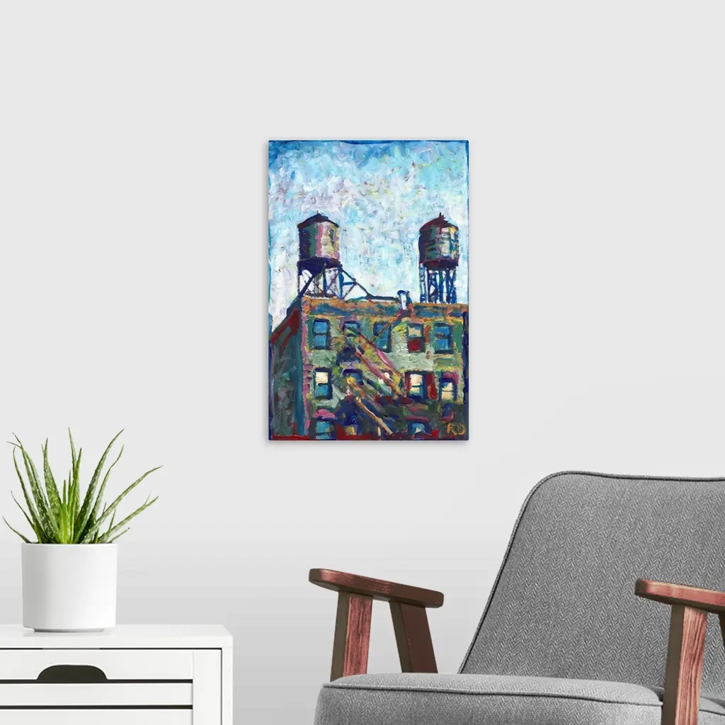 Water Towers in New York by RD Riccoboni, impressionist style painting of NYC in green, blue, red, orange, white and yellows. Architectural and Geometric shapes brushwork and brushstrokes.