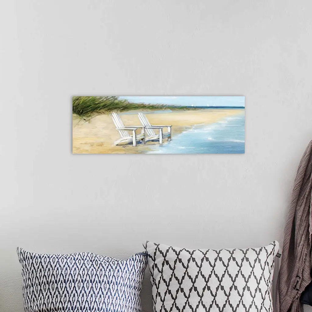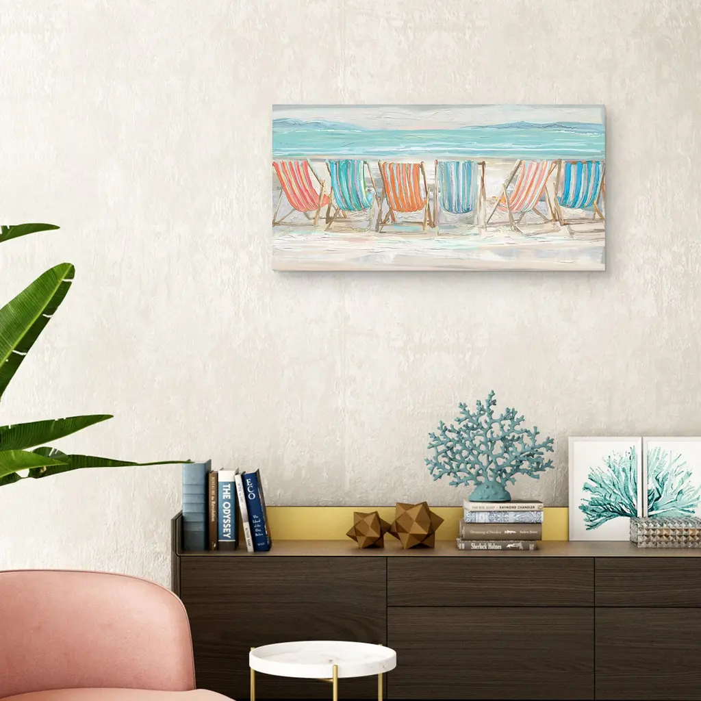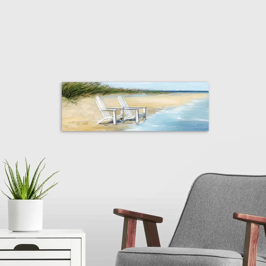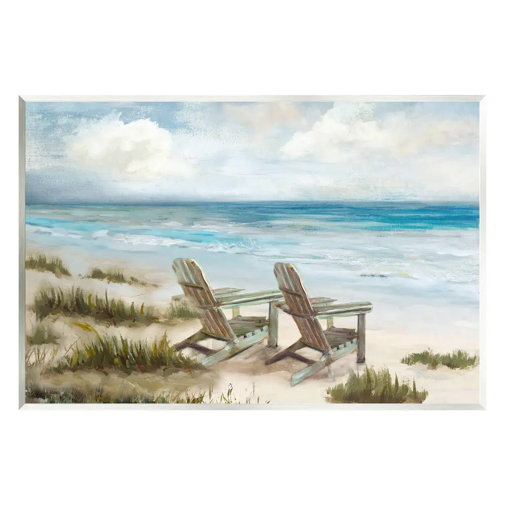 Contemporary painting of two white beach chairs at the edge of the ocean on the coast.