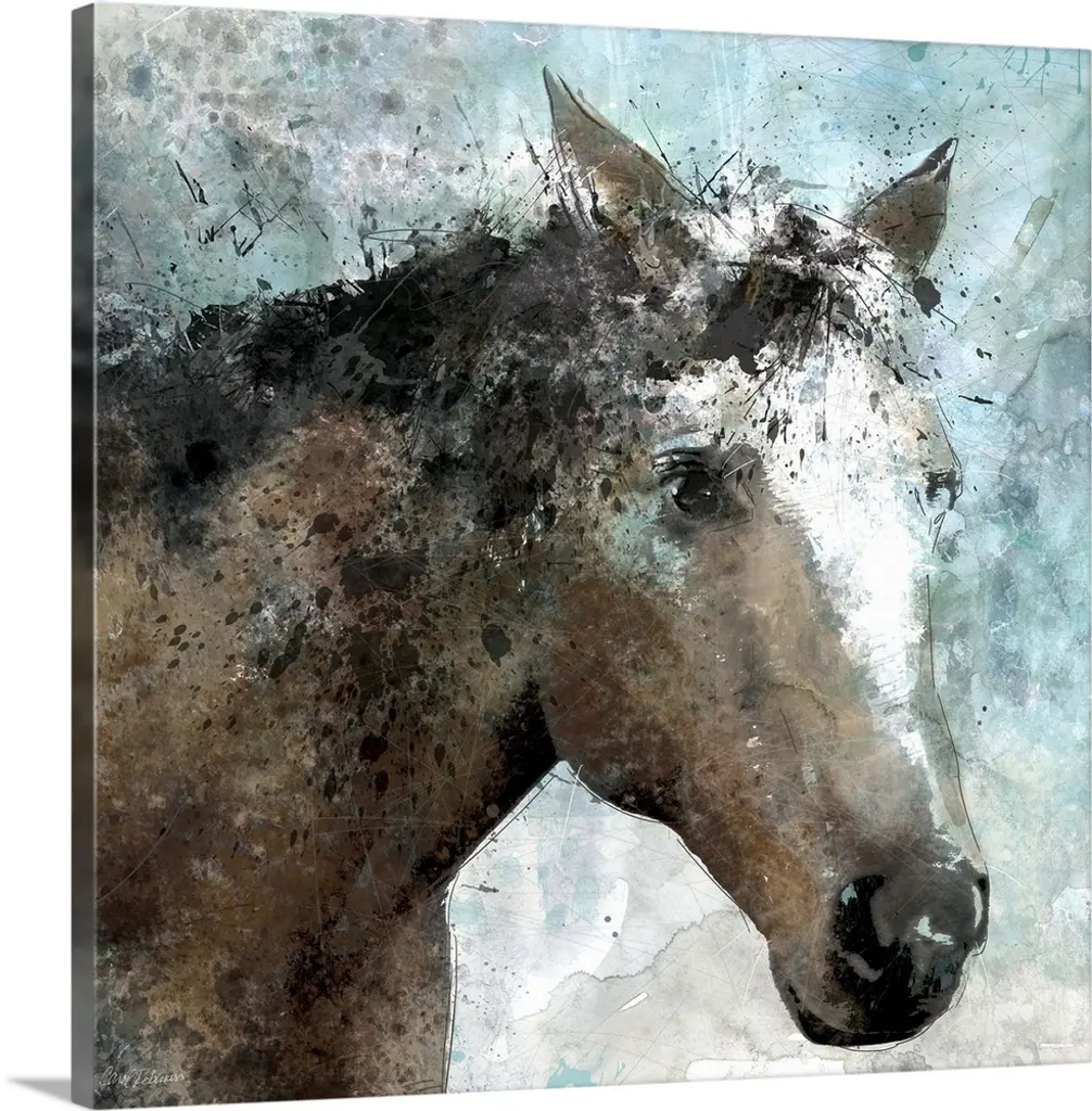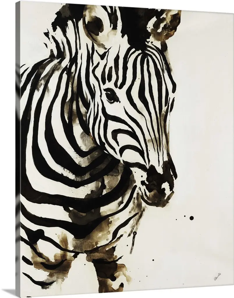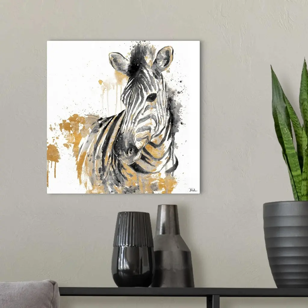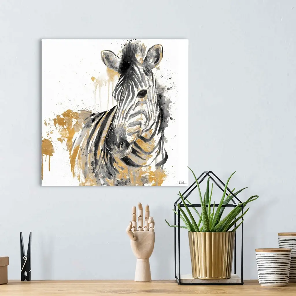 Watercolor painting of a zebra embellished with gold and paint splatters.