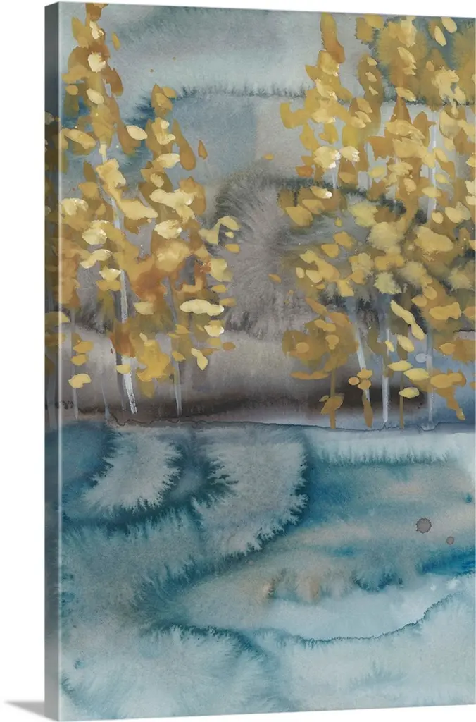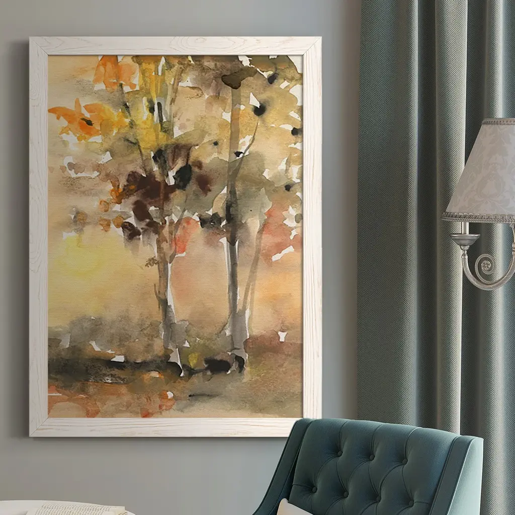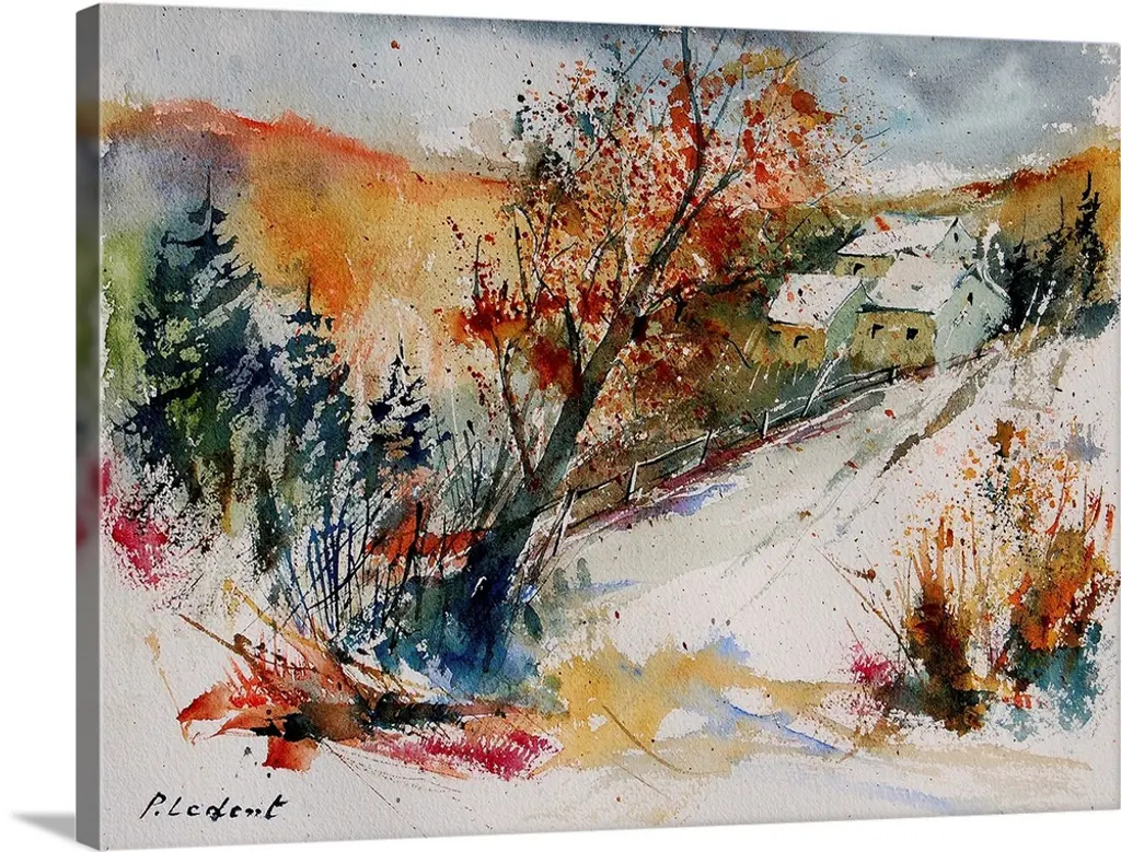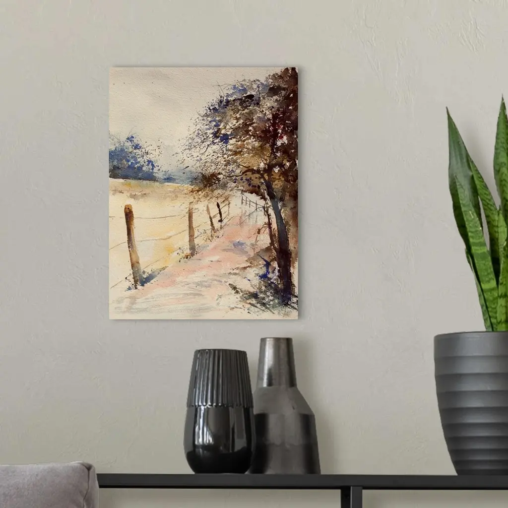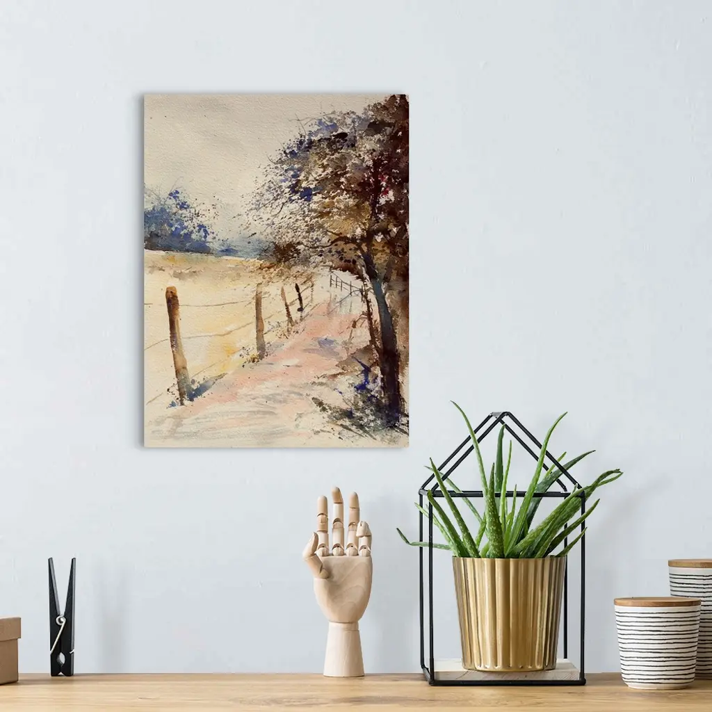 A vertical watercolor painting of a fenced in field lined bya road and trees in the countryside in natural colors of brown, gray and blue.