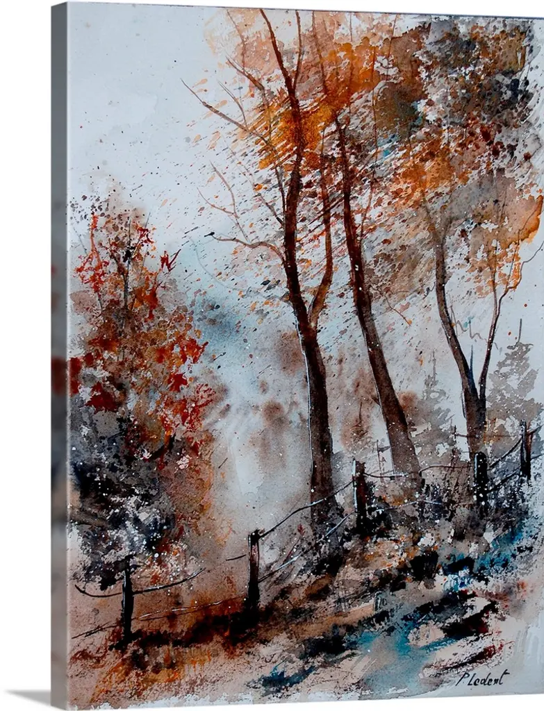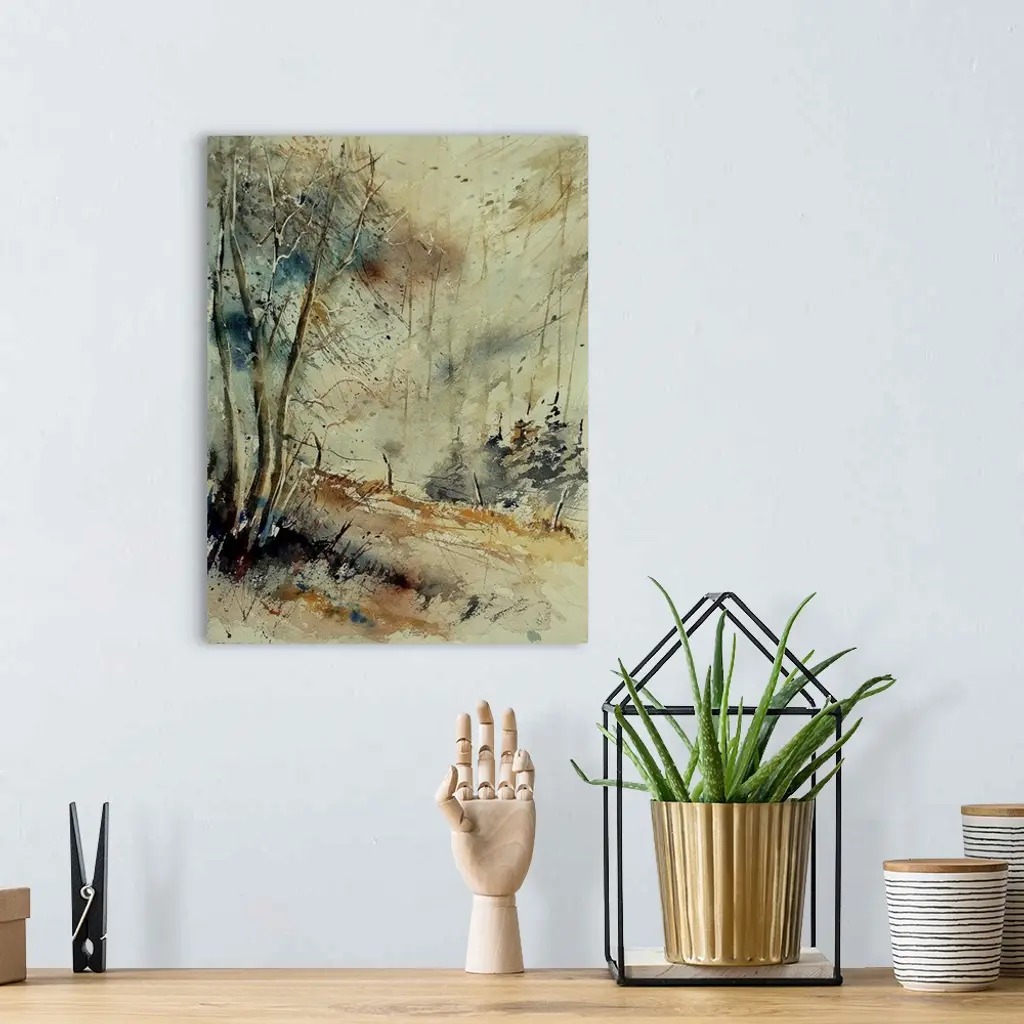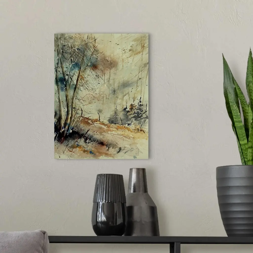 A vertical watercolor painting of a line of trees in the countryside in natural colors of brown, gray and blue.