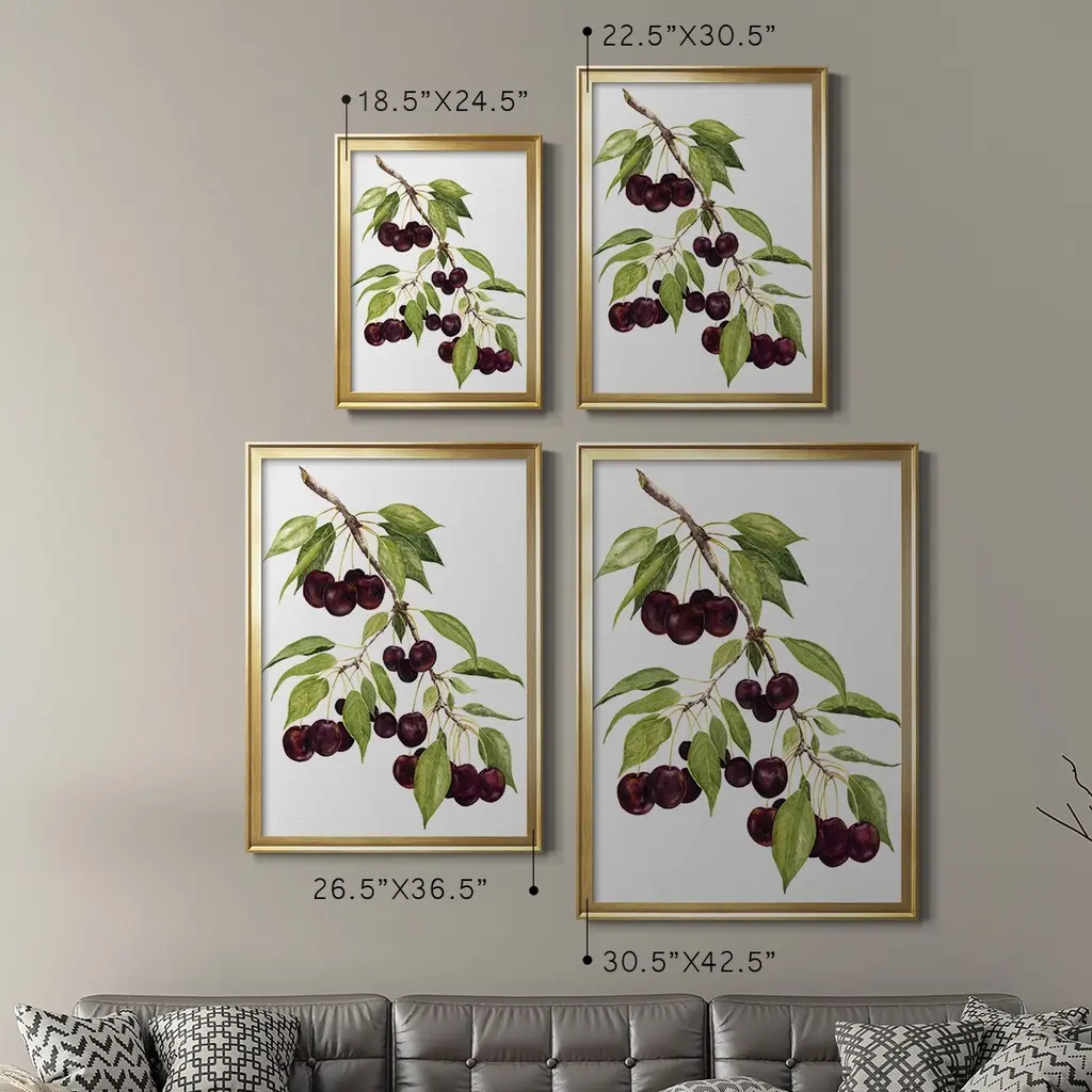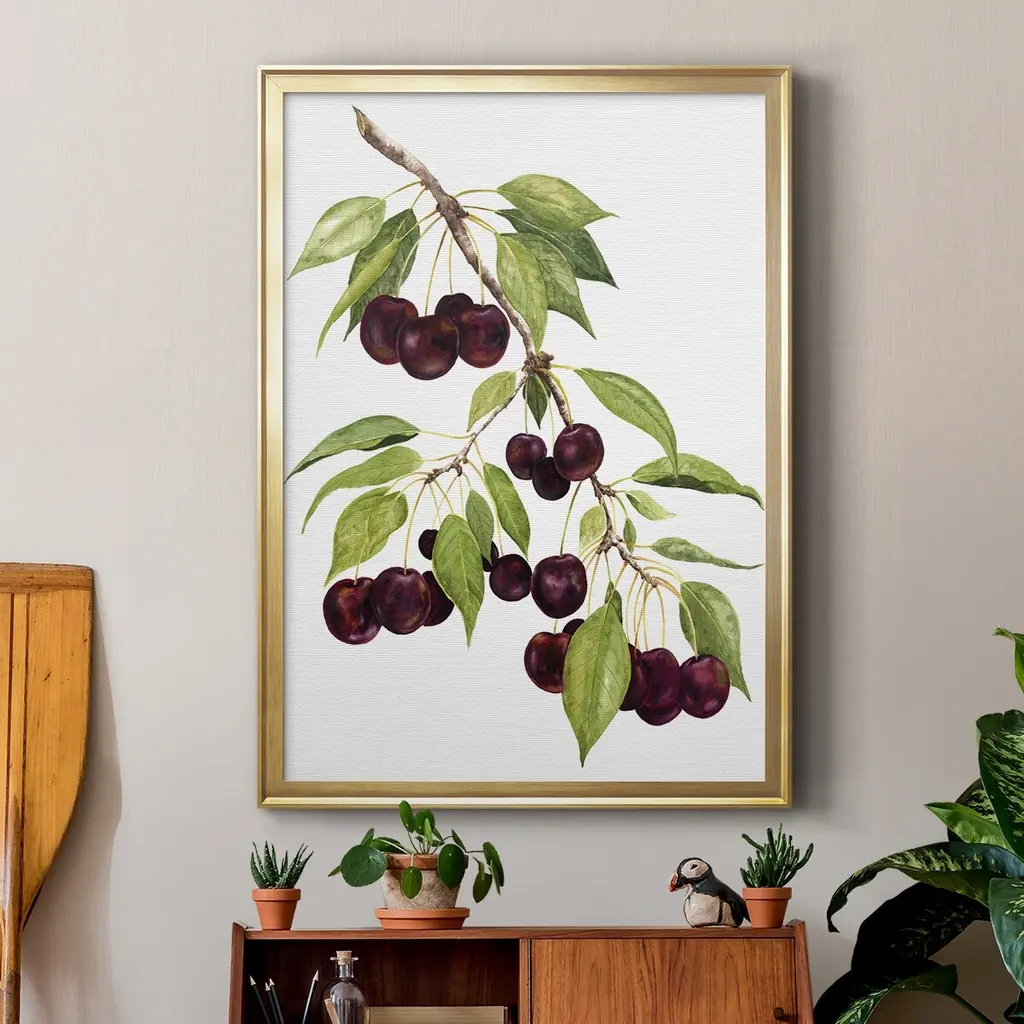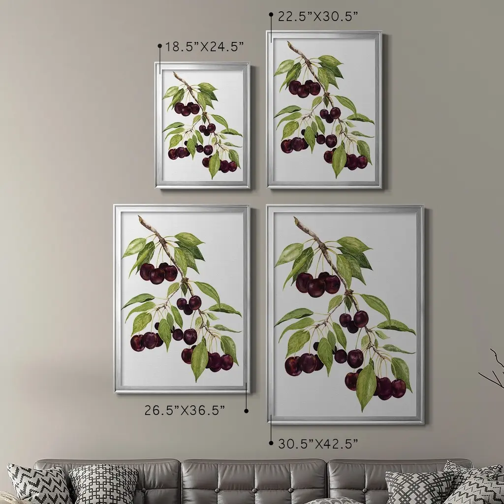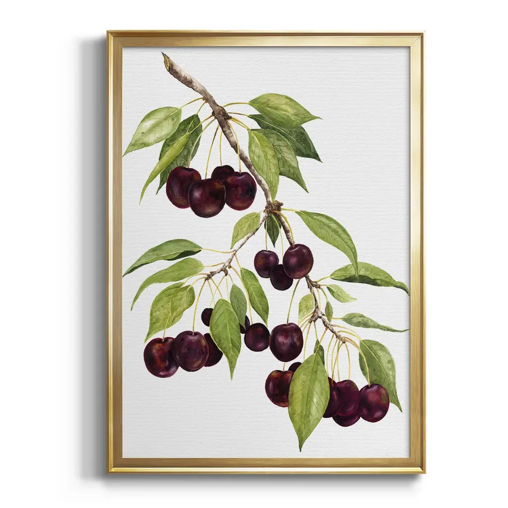 Watercolor Cherries Premium Framed Print - Ready to Hang A Premium Framed Print created to last. Framed in distressed wood and available in an array of sizes and colors Featuring a beveled a solid wood stretcher bar, each piece comes ready to hand 4 SIZES AVAILABLE 30.5''X42.5'' - Overall Size 26.5'X36.5'' - Overall Size 22.5''x30.5'' - Overall Size 18.5''x24.5'' - Overall Size Each piece is made to order. Each piece comes with hanging hardware. Made in the USA Ready to Hang