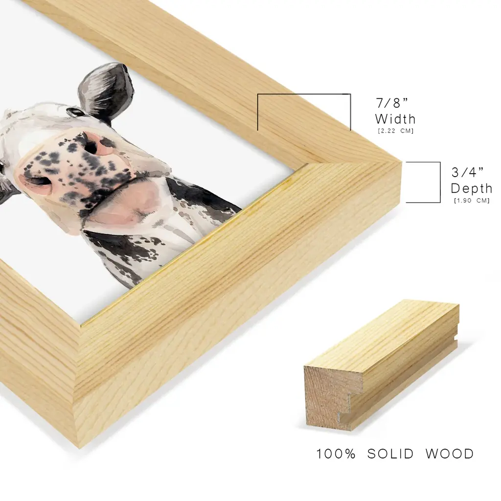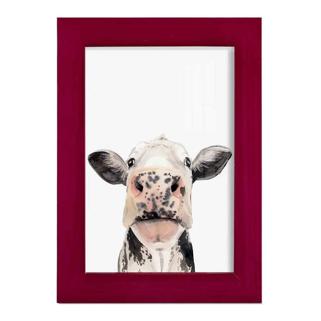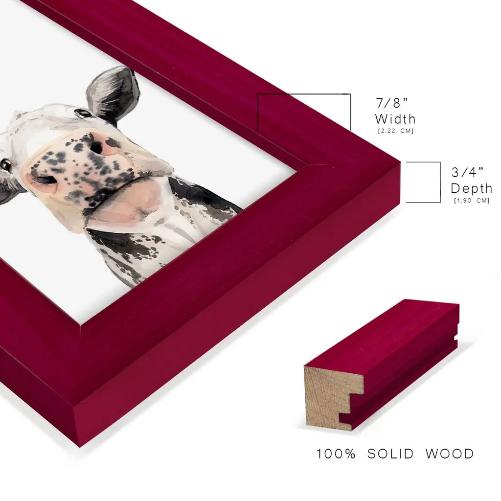 Watercolor Cow Portrait II -EZ SWITCH Framed Print w/glass-Cherry Red A delightful, framed print. Featuring a solid wood frame with real wood glass. This premium print is giclee quality. In addition, every frame features a removable back and table top stand. This allows you to change your art in the future or to just stand the art on a table for a new look. We are sure you'll enjoy our new series of EZ SWITCH Framed Art. Solid Wood Frame Real Glass Removable / Replaceable Art Built in Tabletop Stand Sizes range from 4x6 up to 12x15 - buy just one or pair them up as sets as you see fit.