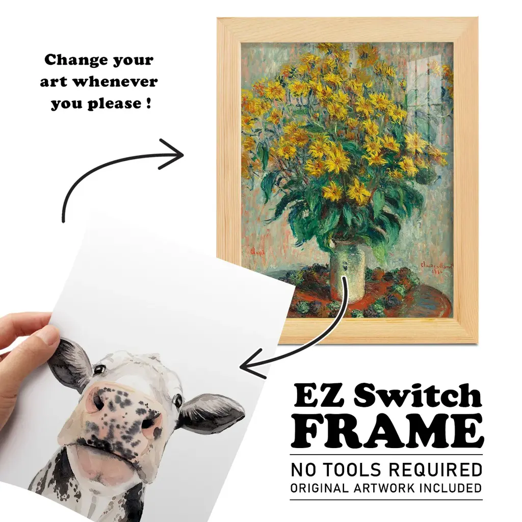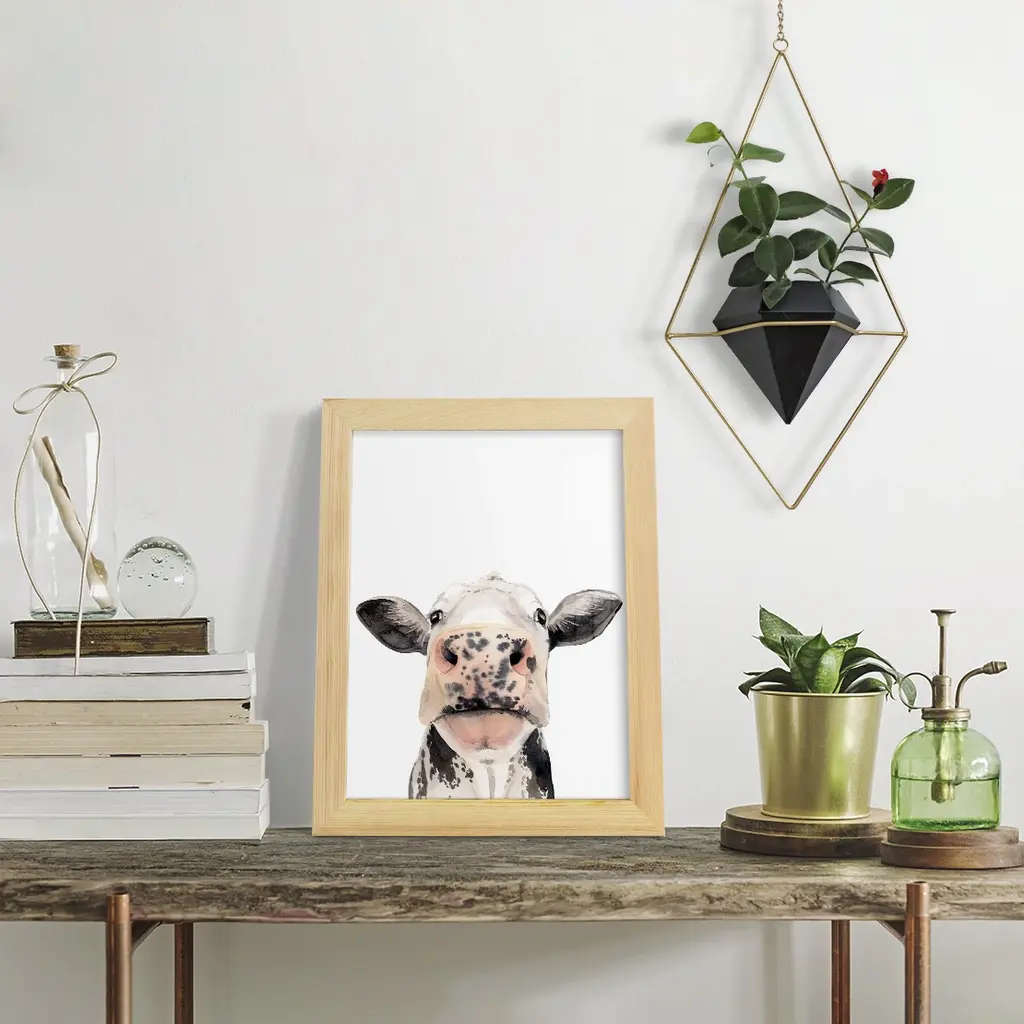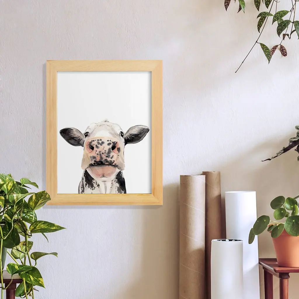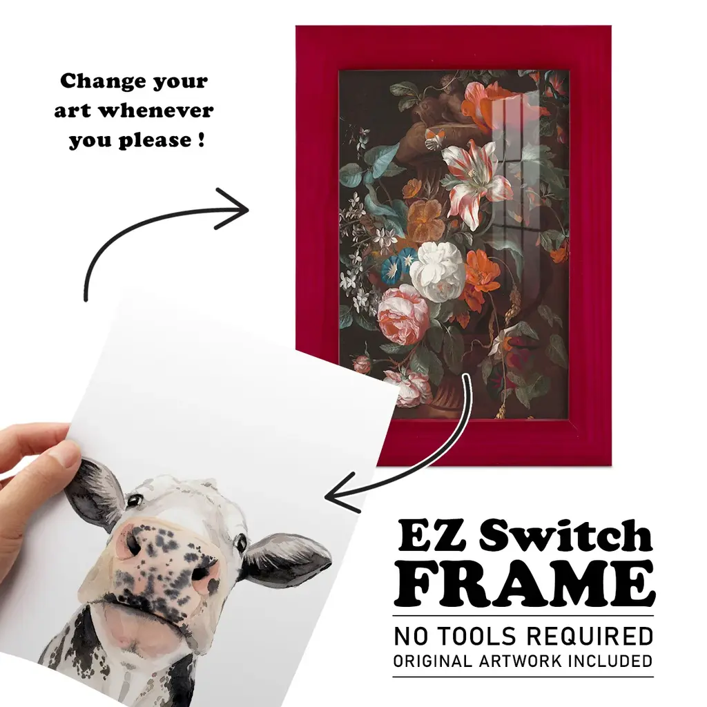Watercolor Cow Portrait II -EZ SWITCH Framed Print w/glass-Cherry Red A delightful, framed print. Featuring a solid wood frame with real wood glass. This premium print is giclee quality. In addition, every frame features a removable back and table top stand. This allows you to change your art in the future or to just stand the art on a table for a new look. We are sure you'll enjoy our new series of EZ SWITCH Framed Art. Solid Wood Frame Real Glass Removable / Replaceable Art Built in Tabletop Stand Sizes range from 4x6 up to 12x15 - buy just one or pair them up as sets as you see fit.