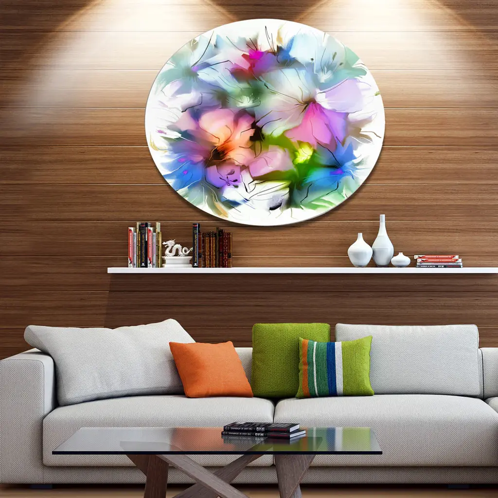 Bring Contemporary Abstraction to your home with this large Circle Metal wall art. This Watercolor Floral Bouquet Metal Artwork makes it the focal point of any room or office. - White Gloss Coating ensures colors are extra vibrant with light reflection.- Aluminum grade Sheet Metal with 1 inch mounting frame on the back giving the illusion that the artwork is floating on the wall..- Mounting Brackets are included along with instructions.- High Quality Digital images are created directly into a glossy aluminum panel producing a stunning and captivating print into the glossy finish of the metal.- Water, Fire and Scratch resistant HD Aluminum panels.- Looks better than any photo paper and guaranteed to last at least 20 years- Easy to clean with a microfiber cloth. Colors are far superior to regular Canvas Art. - Easy to Hang