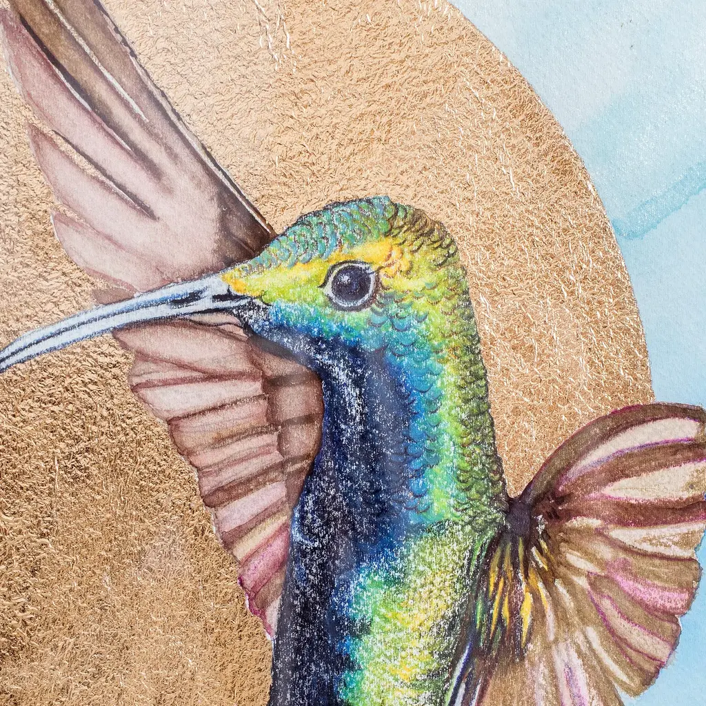The wildlife of Costa Rica are a constant inspiration for Guisselle Mora. Working in watercolor, she depicts a colorful hummingbird hovering against a sun of golden paper. Blue mountains in the background extend to the horizon. Titled "Colibrí Sobre Oro" in Spanish, the painting arrives with a mat board passe partout in a cedarwood frame.