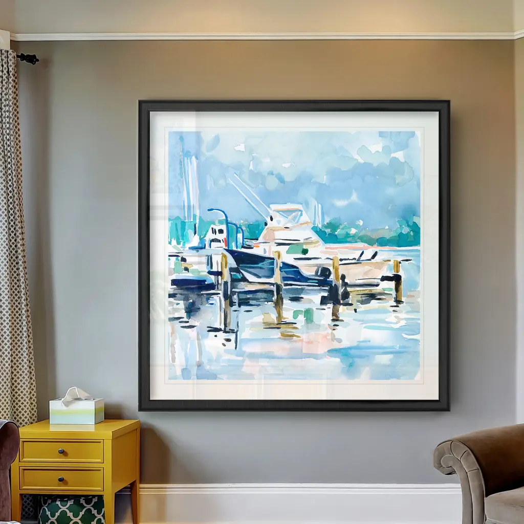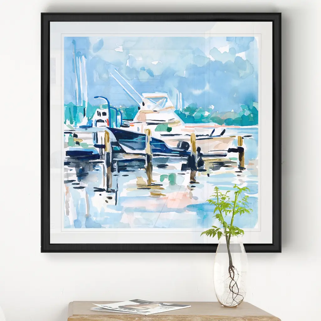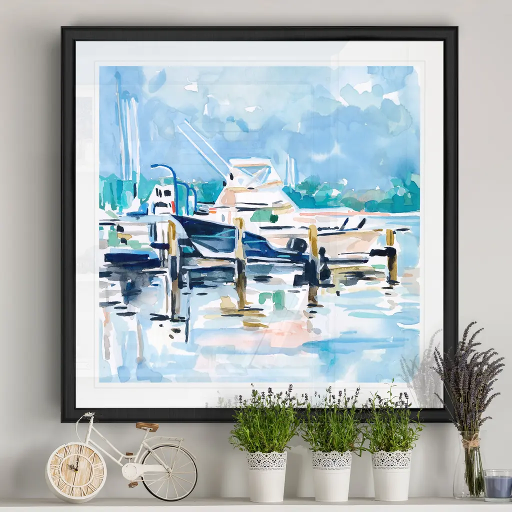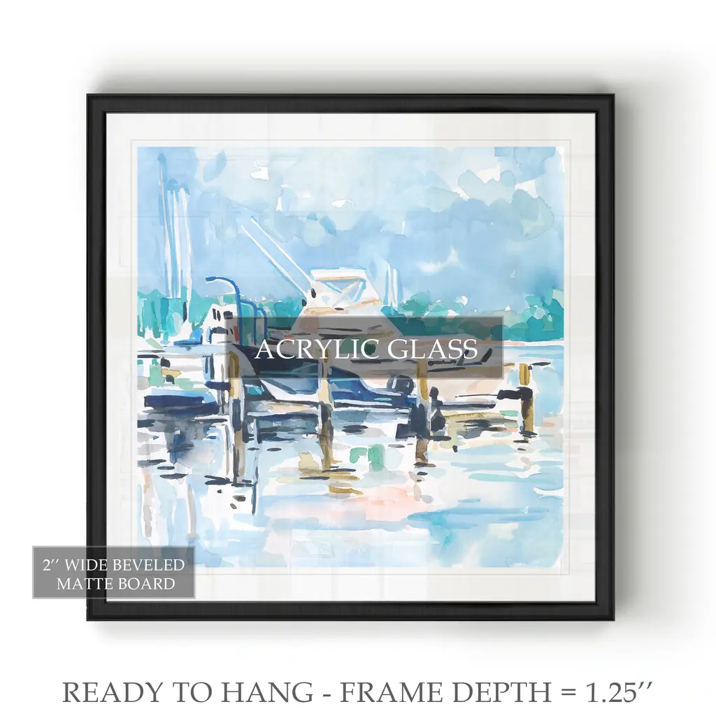 Watercolor Marina II -Black Framed Print A premium Black Framed giclee print Featuring a beveled a matt , acrylic glass, and a high quality giclee print 5 SIZES AVAILABLE 34''x34''- Overall Size 30''x30'' - Overall Size 26''x26''' - Overall Size 22''x22''' - Overall Size 18''x18''' - Overall Size Each piece is made to order. Built to Last Each piece comes ready to hang Fade and Water resistant Made domestically