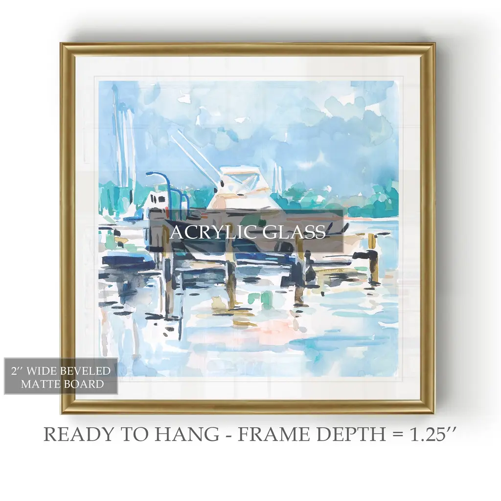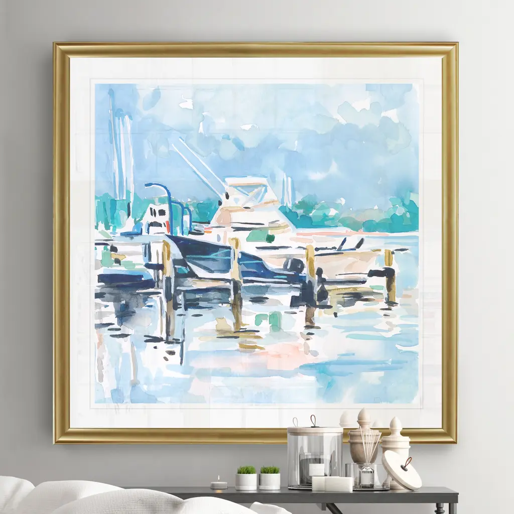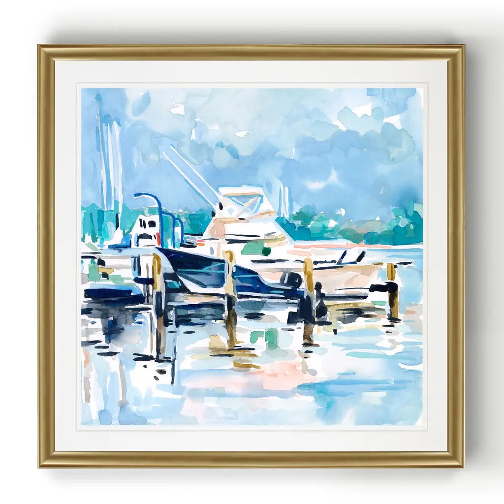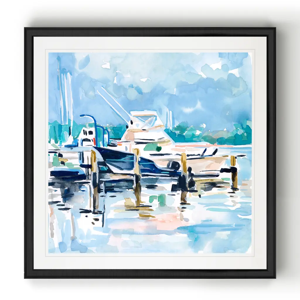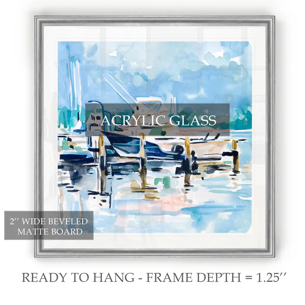 Watercolor Marina II -Black Framed Print A premium Black Framed giclee print Featuring a beveled a matt , acrylic glass, and a high quality giclee print 5 SIZES AVAILABLE 34''x34''- Overall Size 30''x30'' - Overall Size 26''x26''' - Overall Size 22''x22''' - Overall Size 18''x18''' - Overall Size Each piece is made to order. Built to Last Each piece comes ready to hang Fade and Water resistant Made domestically