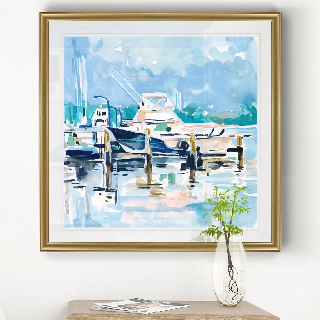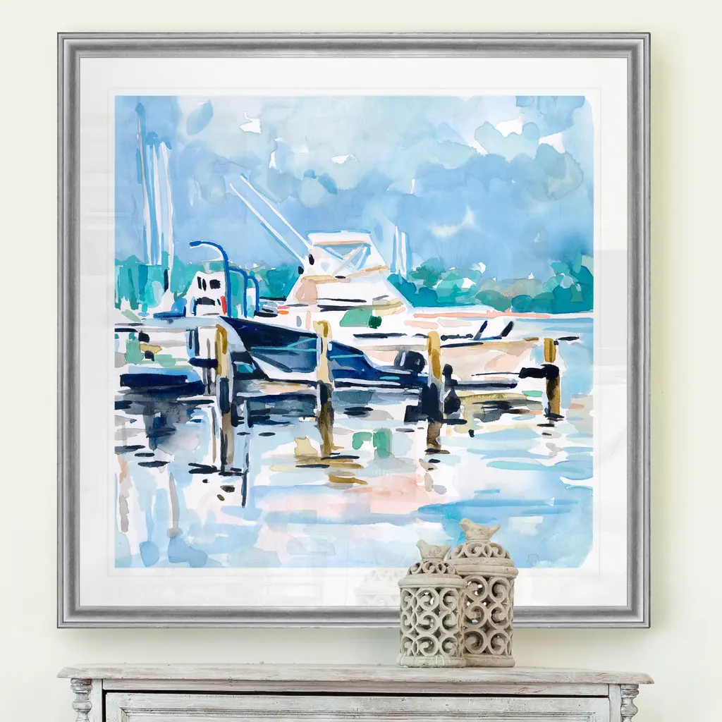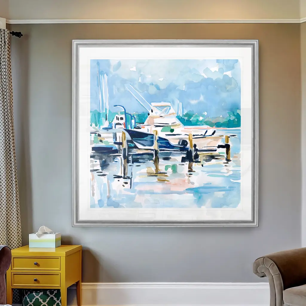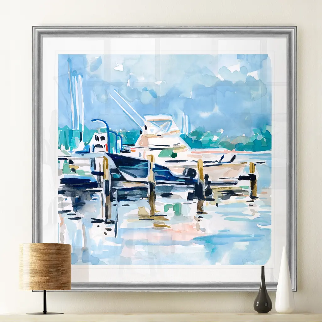 Watercolor Marina II -Black Framed Print A premium Black Framed giclee print Featuring a beveled a matt , acrylic glass, and a high quality giclee print 5 SIZES AVAILABLE 34''x34''- Overall Size 30''x30'' - Overall Size 26''x26''' - Overall Size 22''x22''' - Overall Size 18''x18''' - Overall Size Each piece is made to order. Built to Last Each piece comes ready to hang Fade and Water resistant Made domestically
