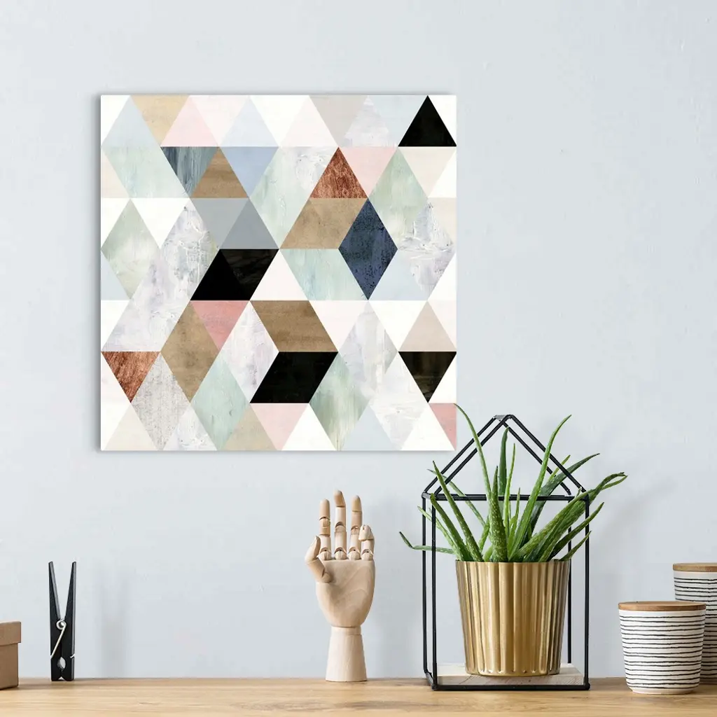 This contemporary artwork features painted textures in various colors arranged in a geometric design.