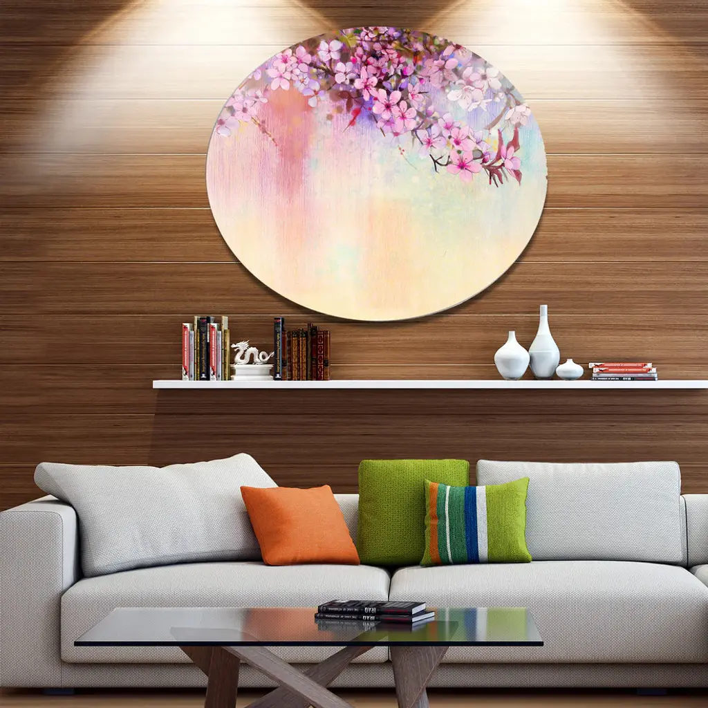 Bring Contemporary Abstraction to your home with this large Circle Metal wall art. This Watercolor Painting Cherry Blossoms Metal Artwork makes it the focal point of any room or office. - White Gloss Coating ensures colors are extra vibrant with light reflection.- Aluminum grade Sheet Metal with 1 inch mounting frame on the back giving the illusion that the artwork is floating on the wall..- Mounting Brackets are included along with instructions.- High Quality Digital images are created directly into a glossy aluminum panel producing a stunning and captivating print into the glossy finish of the metal.- Water, Fire and Scratch resistant HD Aluminum panels.- Looks better than any photo paper and guaranteed to last at least 20 years- Easy to clean with a microfiber cloth. Colors are far superior to regular Canvas Art. - Easy to Hang