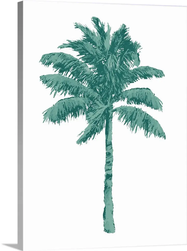 Watercolor artwork of a palm tree with broad green fronds.