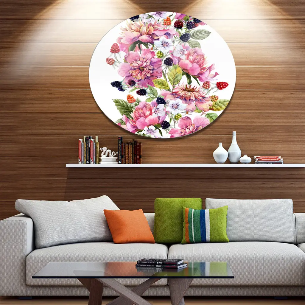 Watercolor Pink Floral Composition, Floral Disc Metal Wall Art, 11"