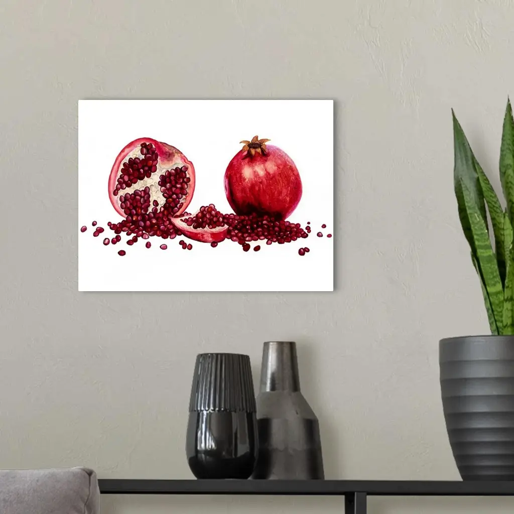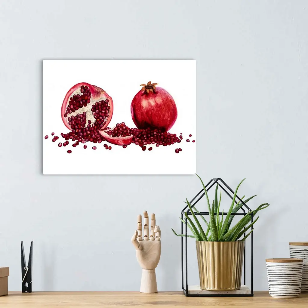 Watercolor painting of a whole and halved pomegranate against a white background.