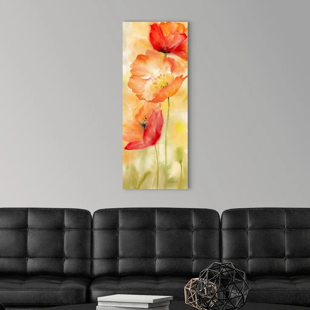 A bright watercolor painting of red, orange and yellow poppies against a faded orange and green backdrop.