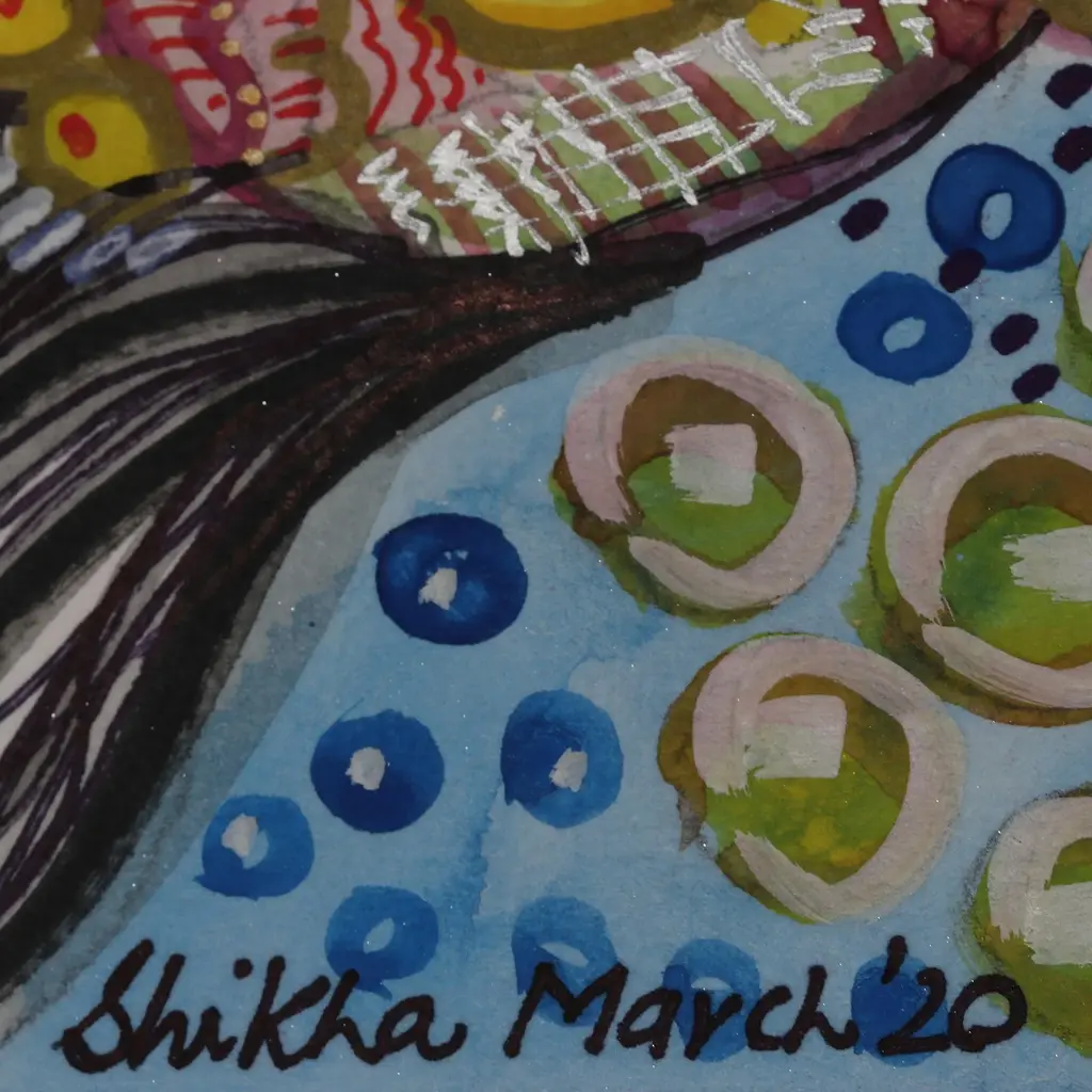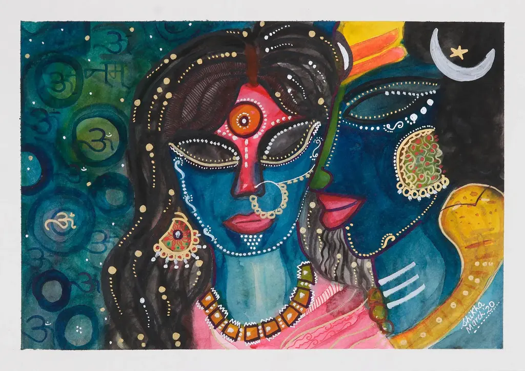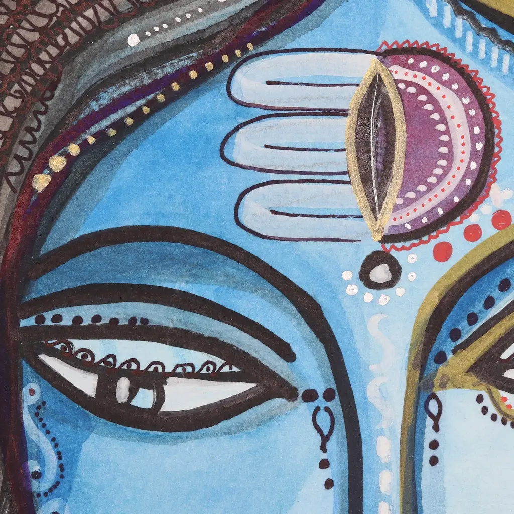 Male and female unite in this unique watercolor by India's Shikha Kaistha. The artist paints the celestial union of Hindu god Lord Shiva and the goddess Parvati as they become an entirely new being called ArdhNareshwar. Parvati is dressed in traditional attire and adorned with gleaming jewels, while om symbols and sun motifs swirl in the blue background.
