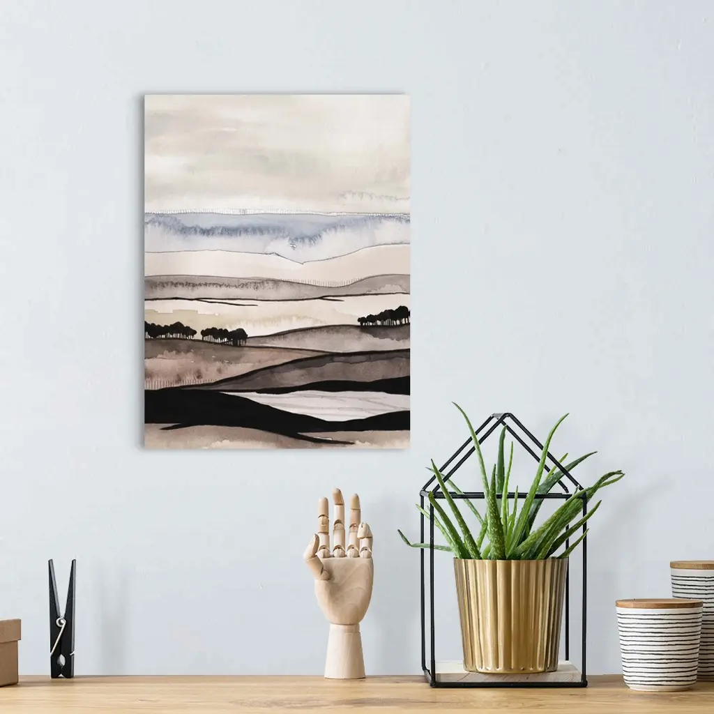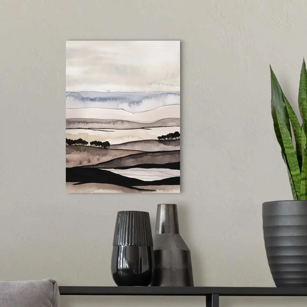Contemporary watercolor abstract painting showing layers of wavy lines resembling a hilly landscape.