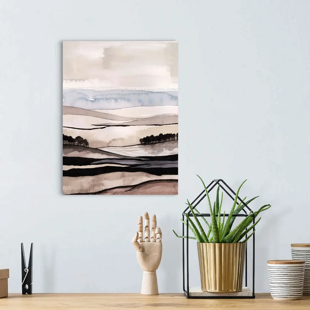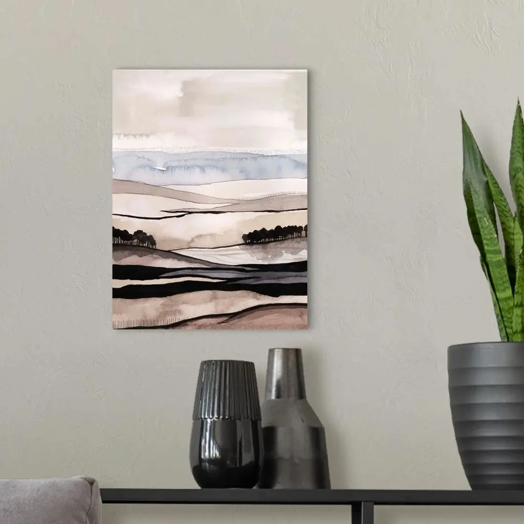 Contemporary watercolor abstract painting showing layers of wavy lines resembling a hilly landscape.