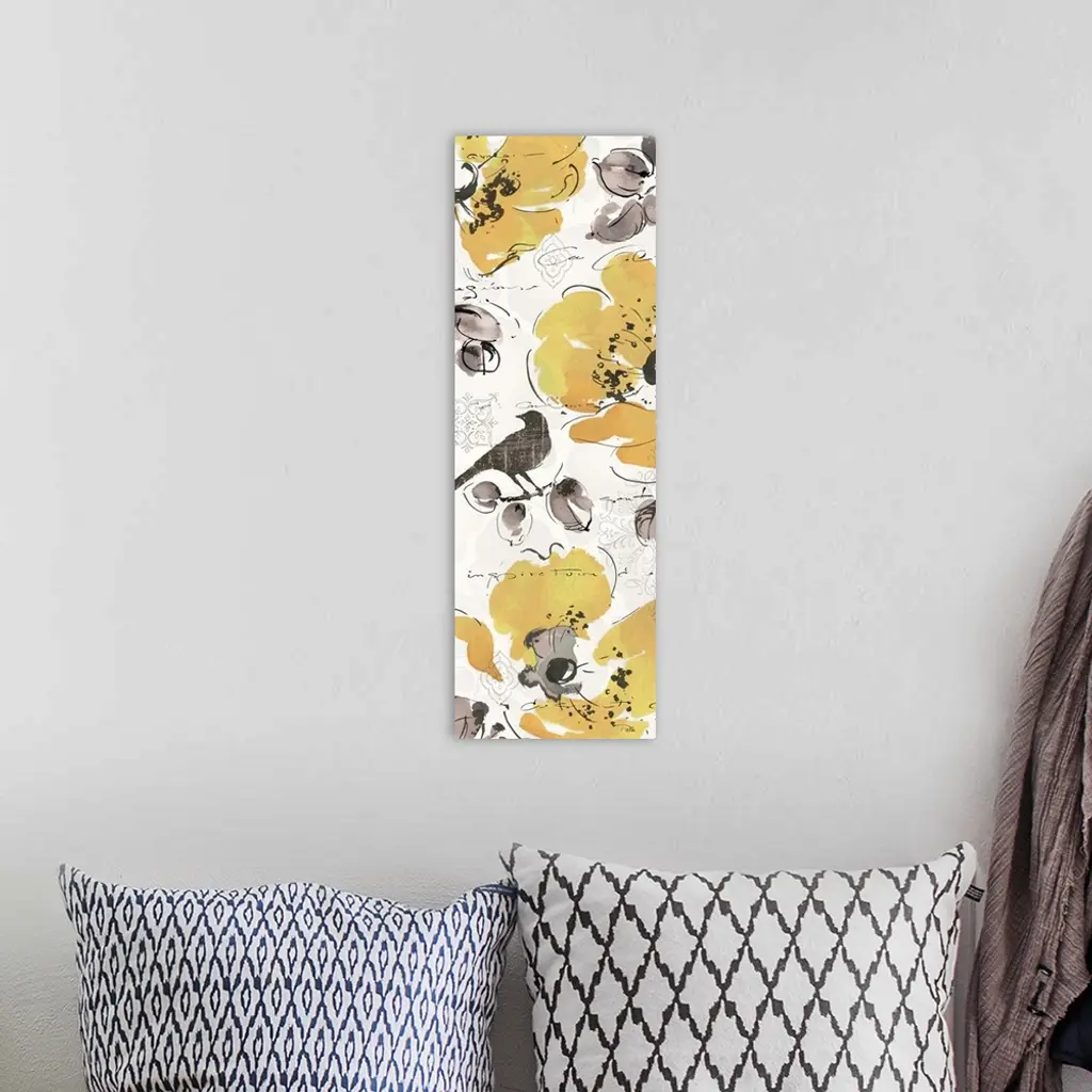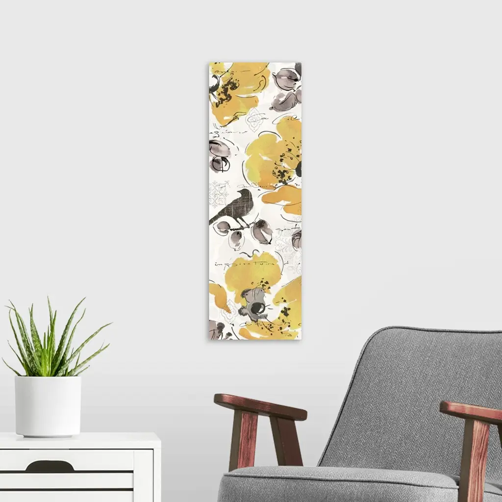 Watercolor painting of yellow flowers with grey birds and leaves.