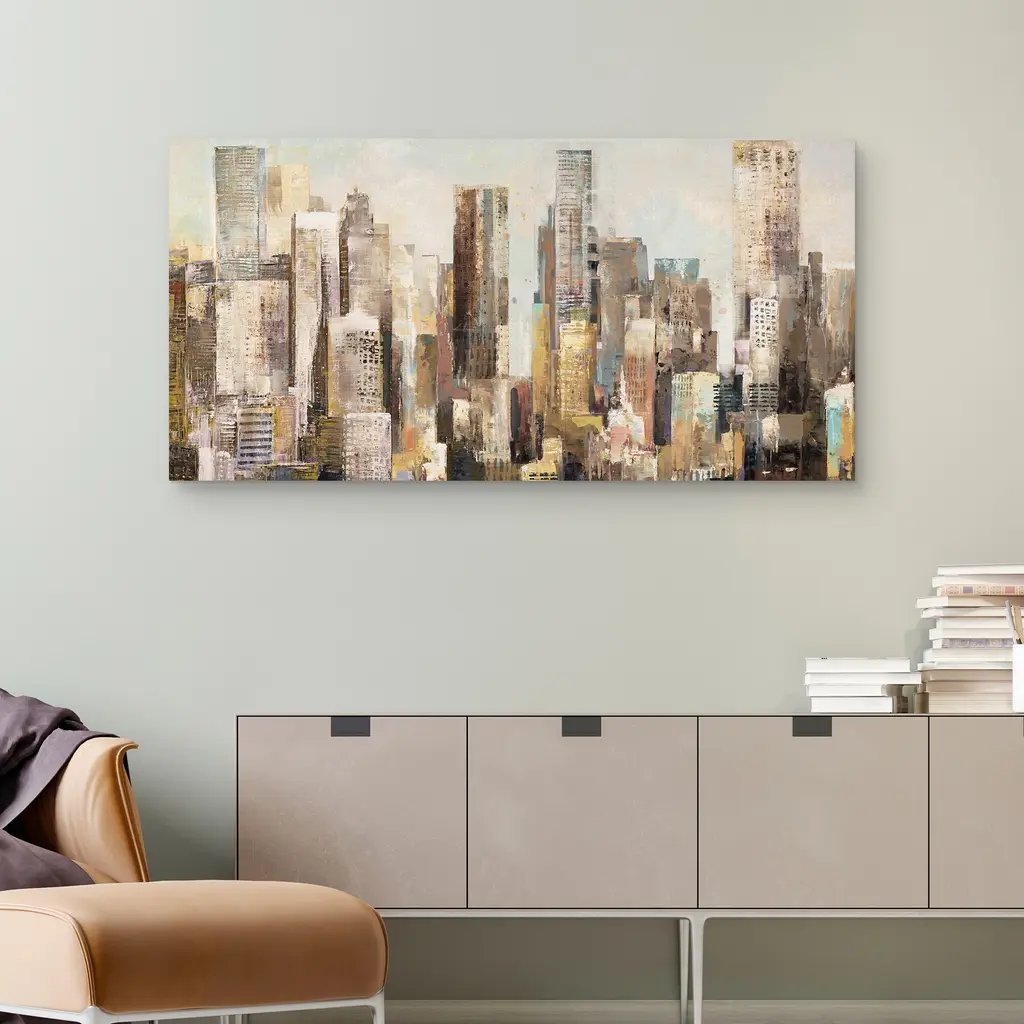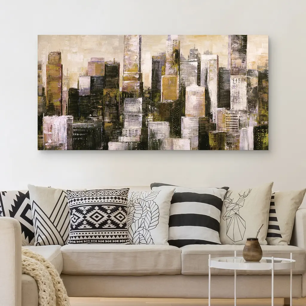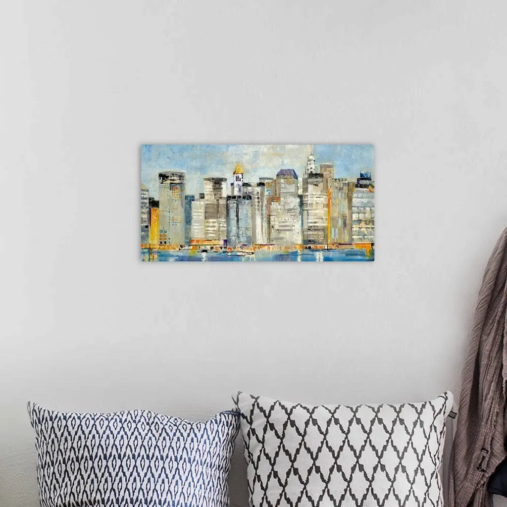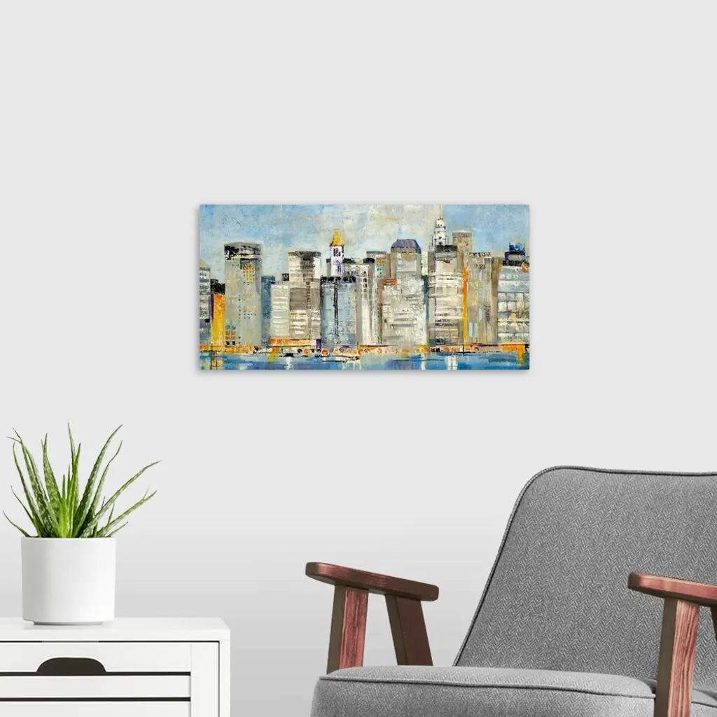 Contemporary abstract painting of a cityscape with buildings and boats reflected on the waterfront.