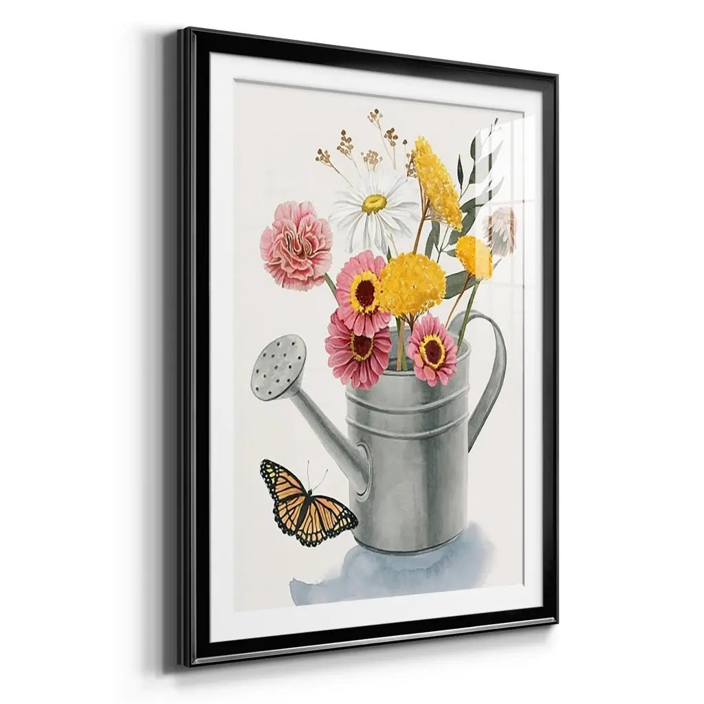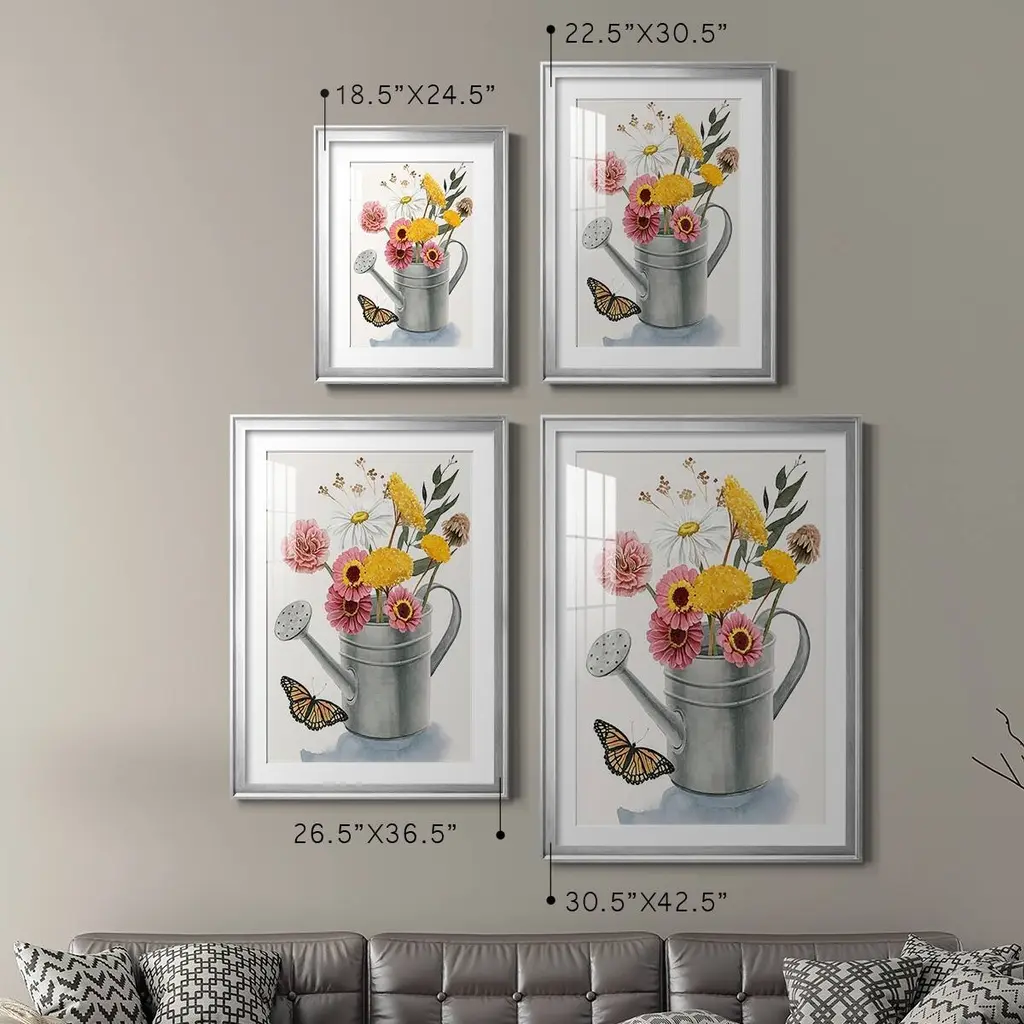 Watering Can Bouquet I Premium Framed Print - Ready to Hang A Premium Framed Print created to last. Framed in distressed wood and available in an array of sizes and colors Featuring a beveled a solid wood stretcher bar, each piece comes ready to hand 4 SIZES AVAILABLE 30.5''X42.5'' - Overall Size 26.5'X36.5'' - Overall Size 22.5''x30.5'' - Overall Size 18.5''x24.5'' - Overall Size Each piece is made to order. Each piece comes with hanging hardware. Made in the USA Ready to Hang Giclee Paper Print Acrylic Glass Beveled Matt Board