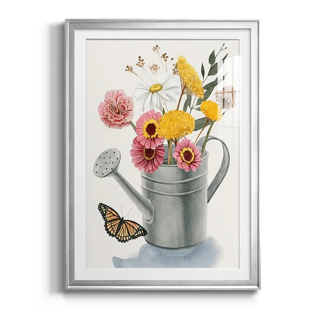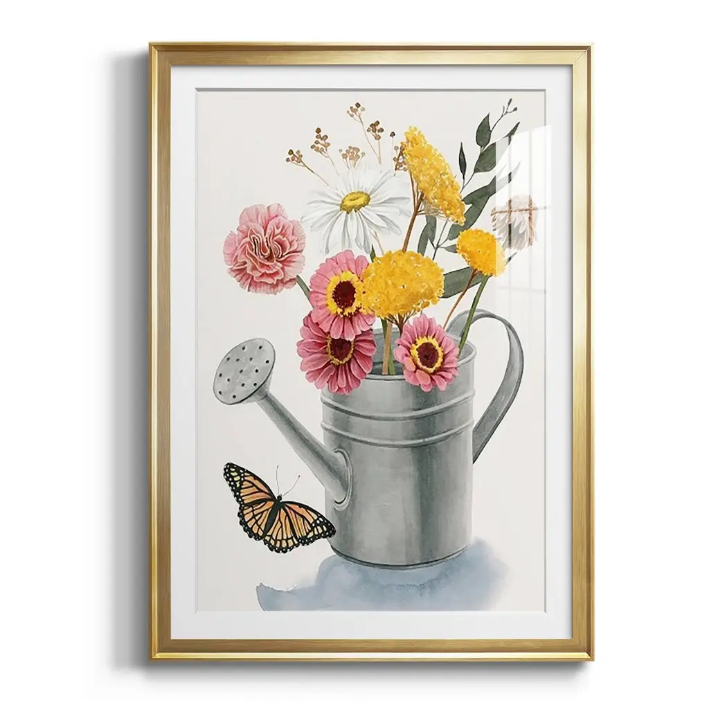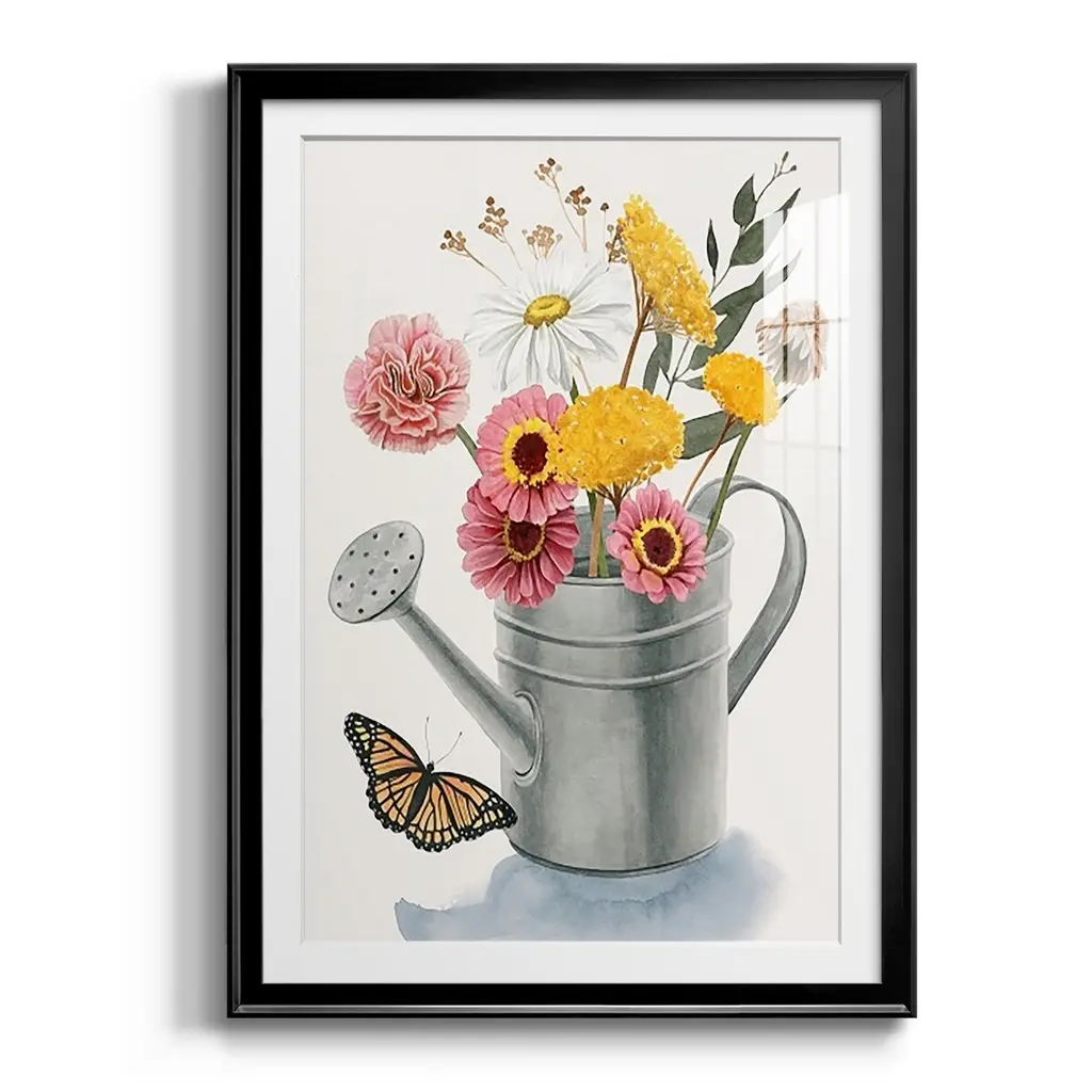 Watering Can Bouquet I Premium Framed Print - Ready to Hang A Premium Framed Print created to last. Framed in distressed wood and available in an array of sizes and colors Featuring a beveled a solid wood stretcher bar, each piece comes ready to hand 4 SIZES AVAILABLE 30.5''X42.5'' - Overall Size 26.5'X36.5'' - Overall Size 22.5''x30.5'' - Overall Size 18.5''x24.5'' - Overall Size Each piece is made to order. Each piece comes with hanging hardware. Made in the USA Ready to Hang Giclee Paper Print Acrylic Glass Beveled Matt Board