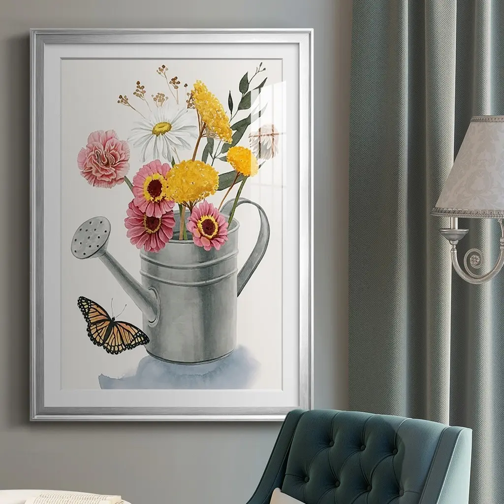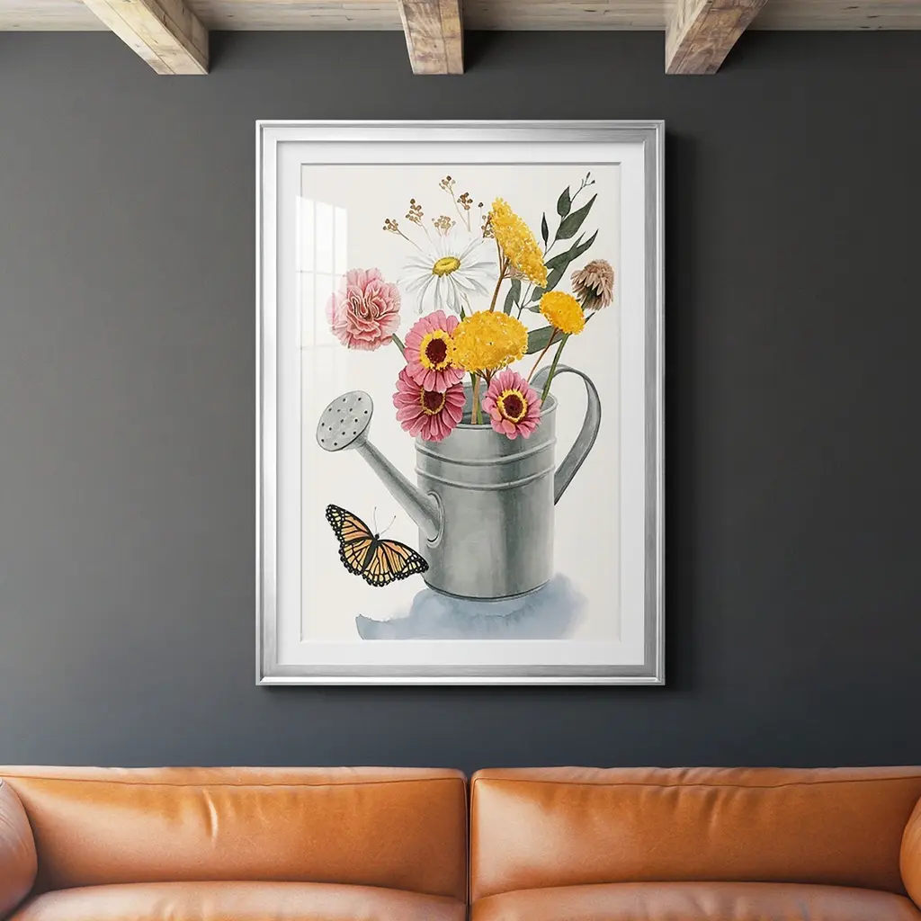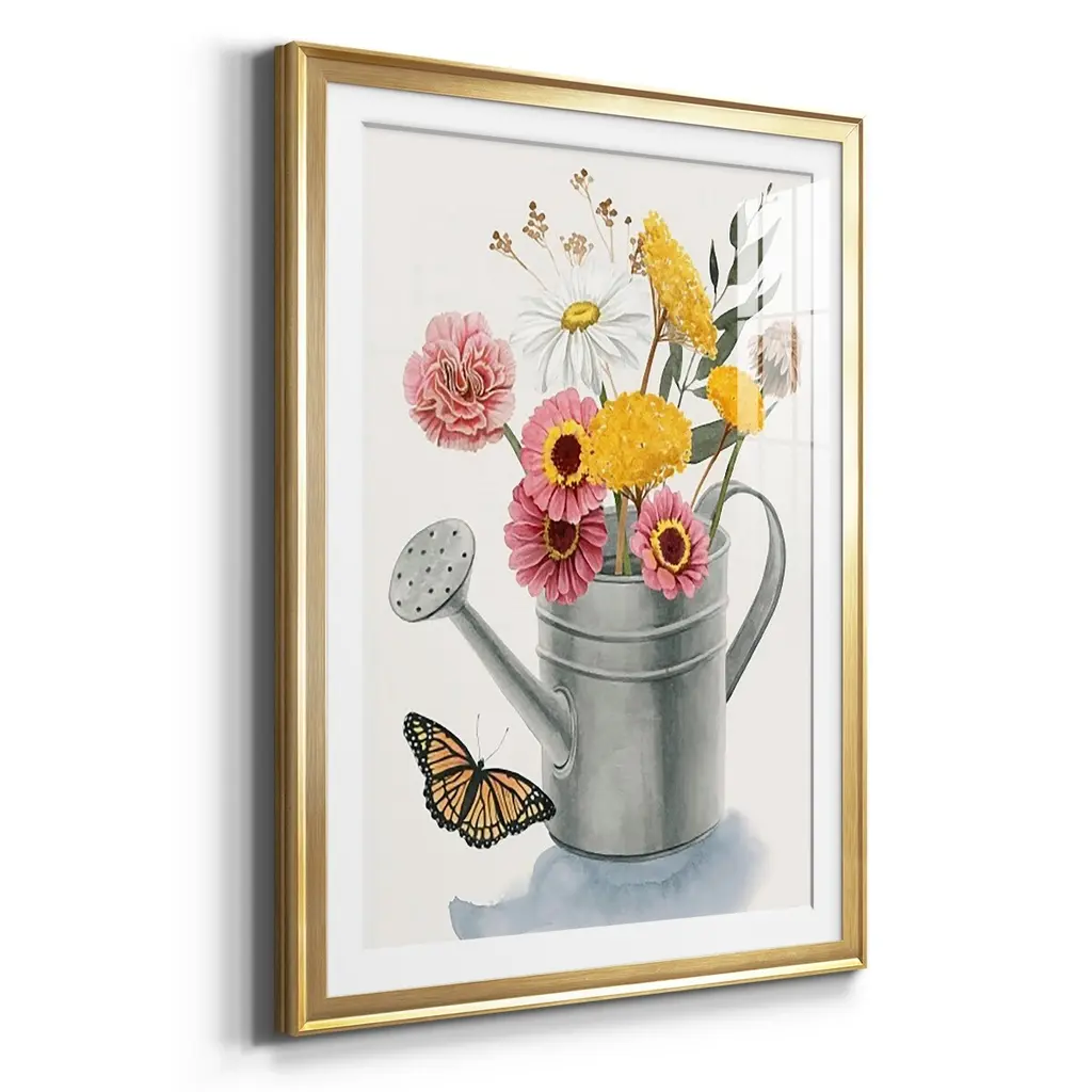 Watering Can Bouquet I Premium Framed Print - Ready to Hang A Premium Framed Print created to last. Framed in distressed wood and available in an array of sizes and colors Featuring a beveled a solid wood stretcher bar, each piece comes ready to hand 4 SIZES AVAILABLE 30.5''X42.5'' - Overall Size 26.5'X36.5'' - Overall Size 22.5''x30.5'' - Overall Size 18.5''x24.5'' - Overall Size Each piece is made to order. Each piece comes with hanging hardware. Made in the USA Ready to Hang Giclee Paper Print Acrylic Glass Beveled Matt Board