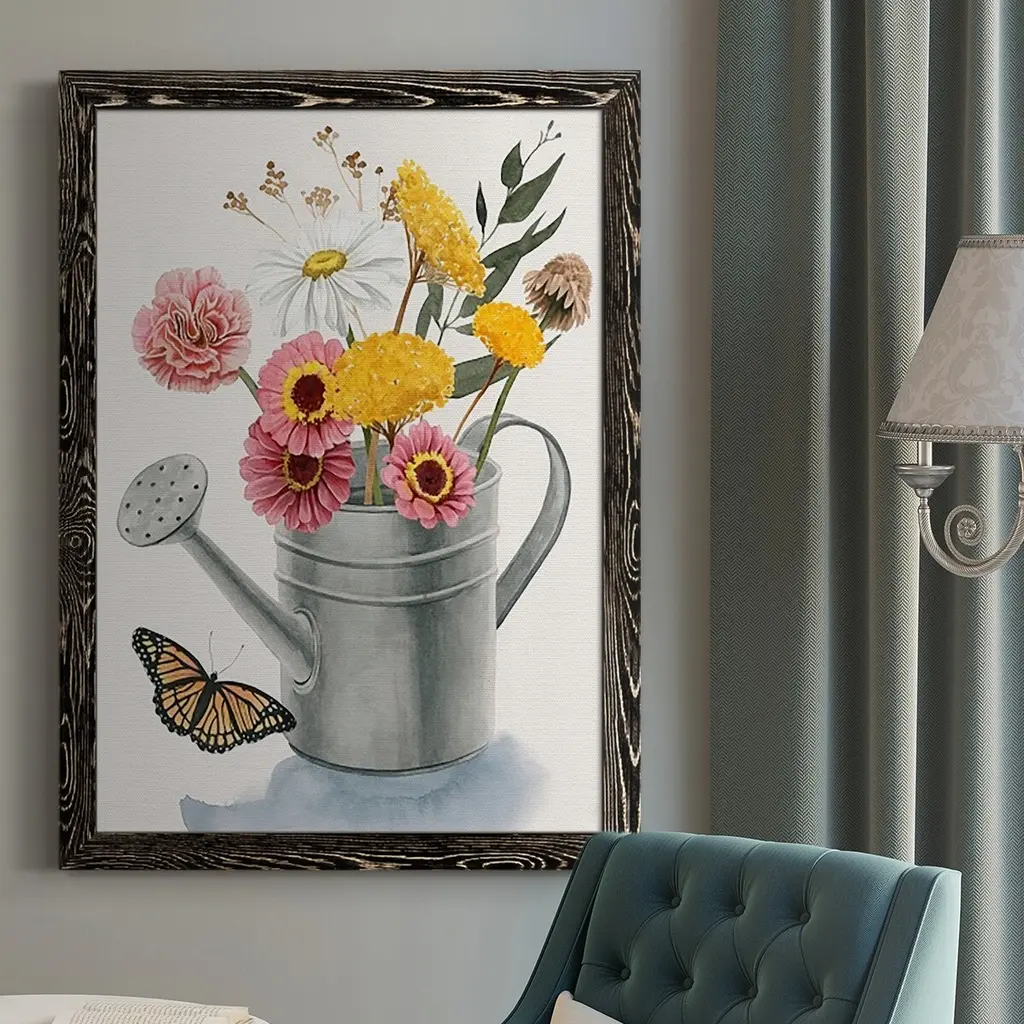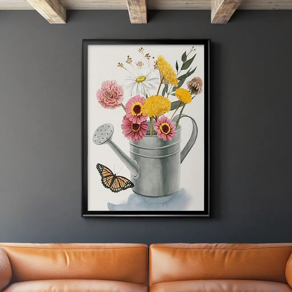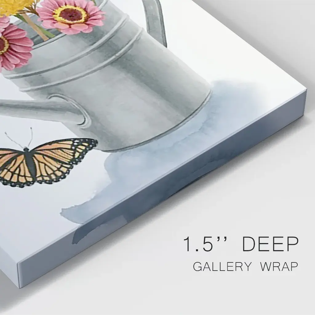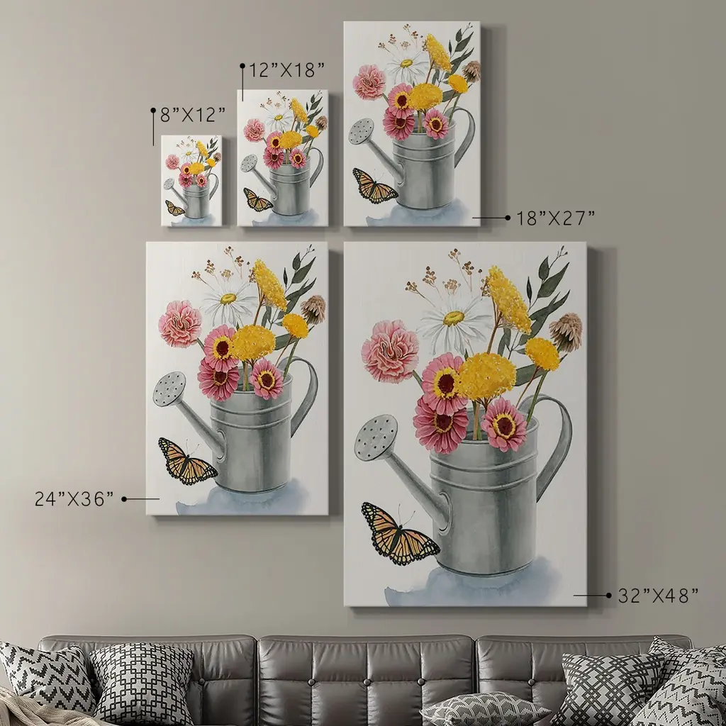 Watering Can Bouquet I Premium Gallery Wrapped Canvas - Ready to Hang A premium hand stretched gallery wrapped canvas print created to last. Featuring a beveled a solid wood stretcher bar, each piece comes ready to hand 6 SIZES AVAILABLE 8''X12'' - Overall Size 12''X18'' - Overall Size 18''X27'' - Overall Size 24''x36'' - Overall Size 32''x48'' - Overall Size 40''x60'' - Overall Size Each piece is made to order. Built to Last Each piece comes ready to hang Solid wood stretcher Fade and Water resistant Made domestically