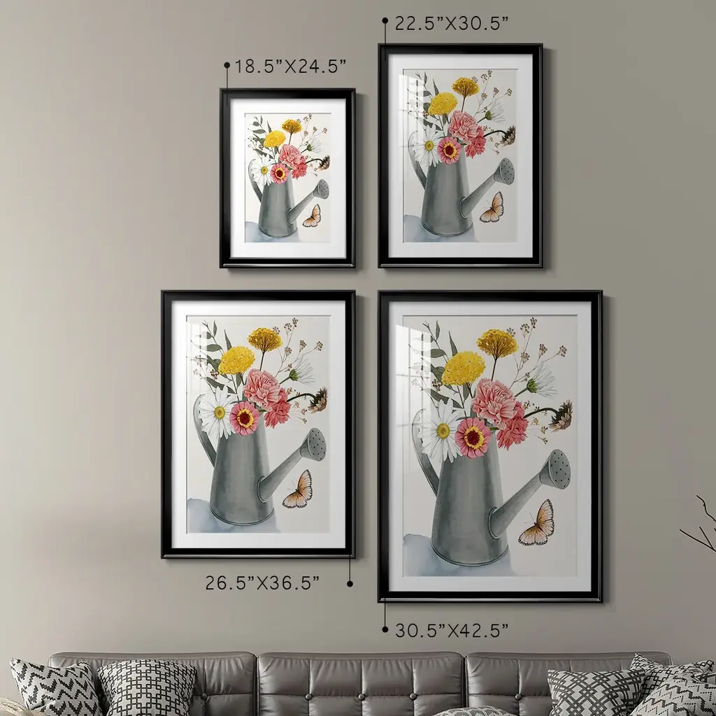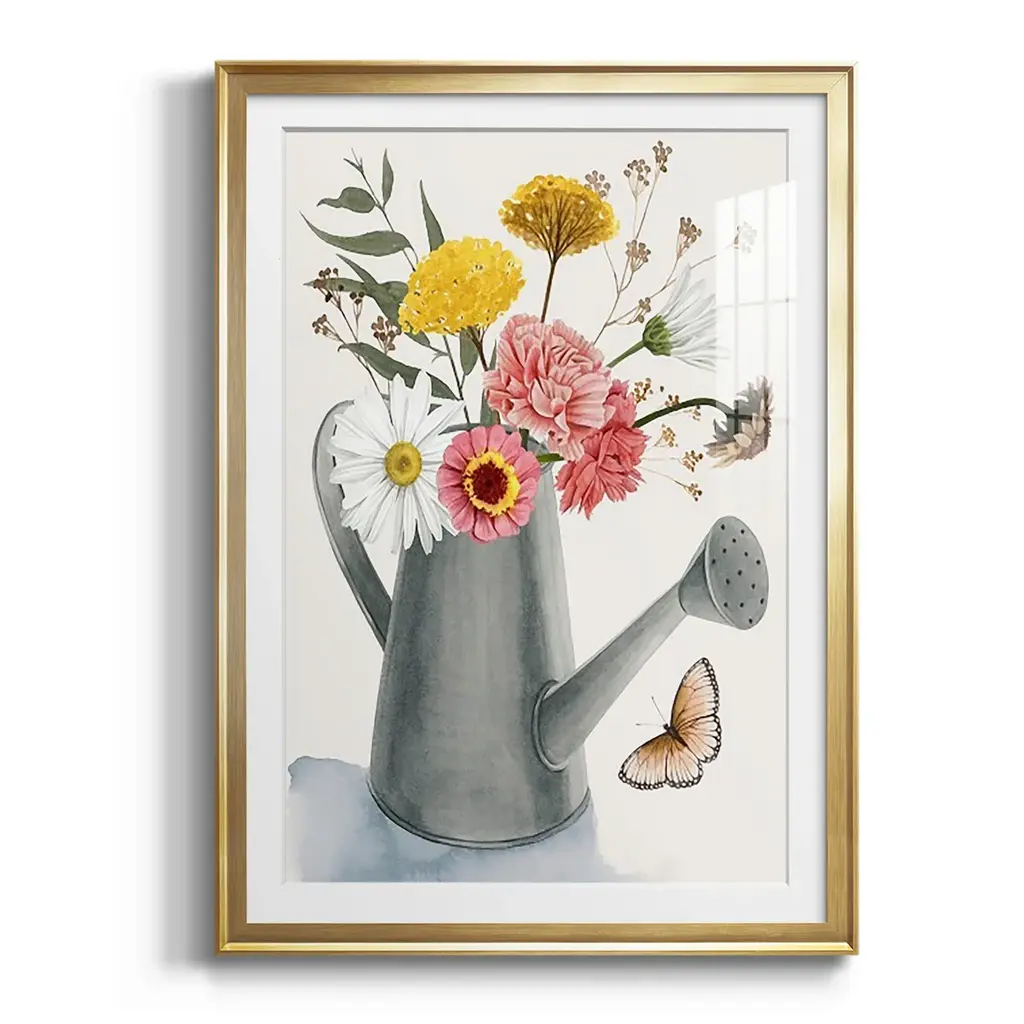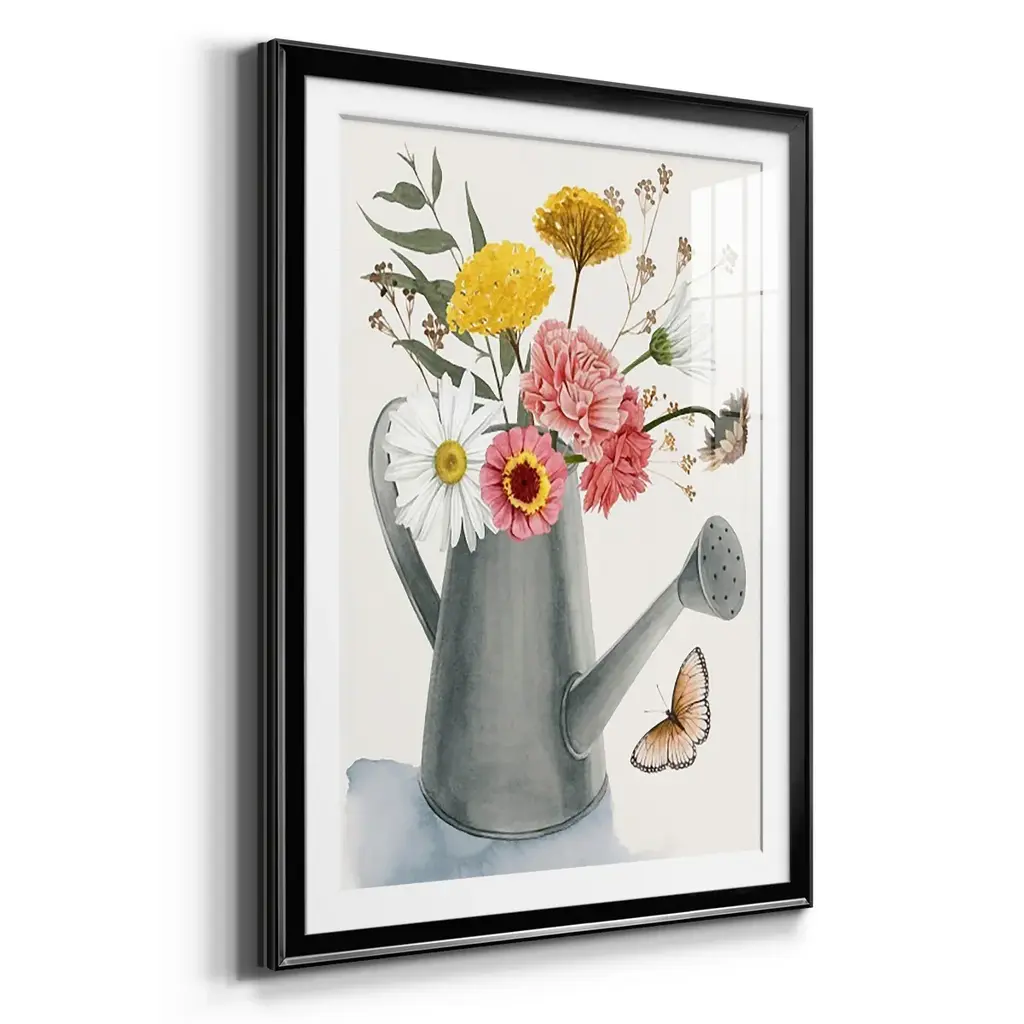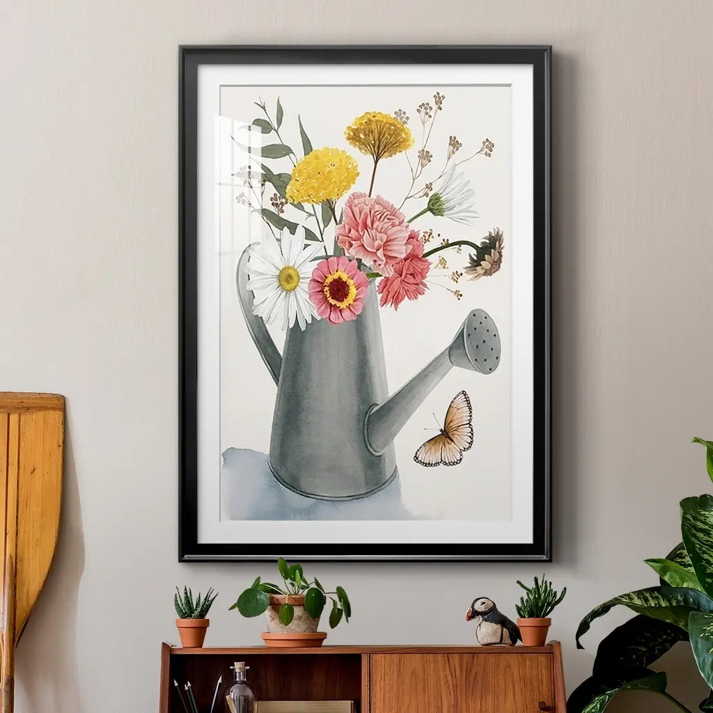 Watering Can Bouquet II Premium Framed Print - Ready to Hang A Premium Framed Print created to last. Framed in distressed wood and available in an array of sizes and colors Featuring a beveled a solid wood stretcher bar, each piece comes ready to hand 4 SIZES AVAILABLE 30.5''X42.5'' - Overall Size 26.5'X36.5'' - Overall Size 22.5''x30.5'' - Overall Size 18.5''x24.5'' - Overall Size Each piece is made to order. Each piece comes with hanging hardware. Made in the USA Ready to Hang Giclee Paper Print Acrylic Glass Beveled Matt Board