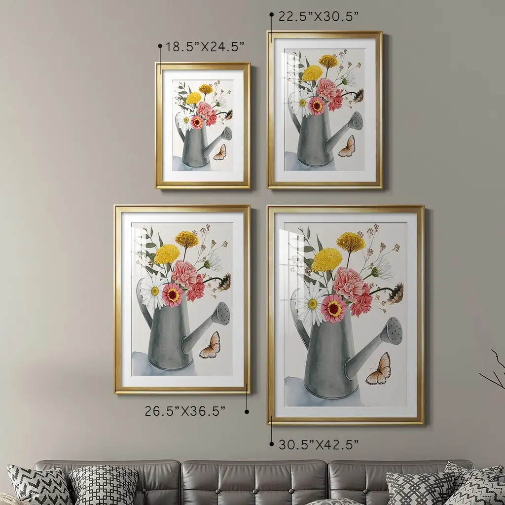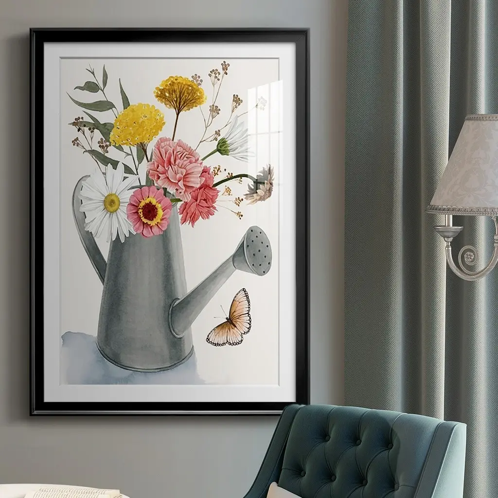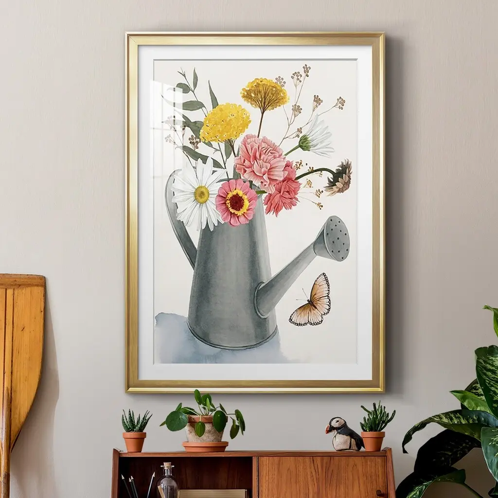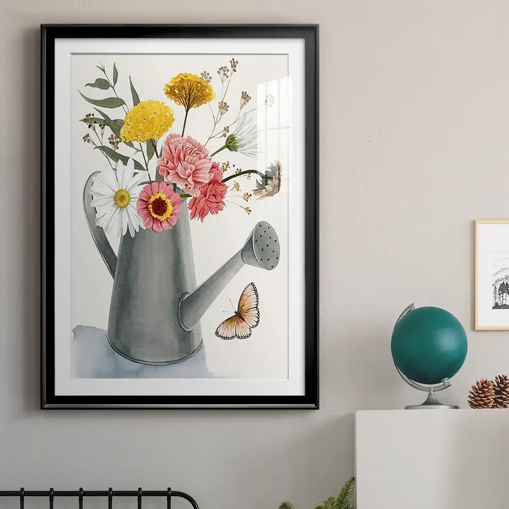 Watering Can Bouquet II Premium Framed Print - Ready to Hang A Premium Framed Print created to last. Framed in distressed wood and available in an array of sizes and colors Featuring a beveled a solid wood stretcher bar, each piece comes ready to hand 4 SIZES AVAILABLE 30.5''X42.5'' - Overall Size 26.5'X36.5'' - Overall Size 22.5''x30.5'' - Overall Size 18.5''x24.5'' - Overall Size Each piece is made to order. Each piece comes with hanging hardware. Made in the USA Ready to Hang Giclee Paper Print Acrylic Glass Beveled Matt Board