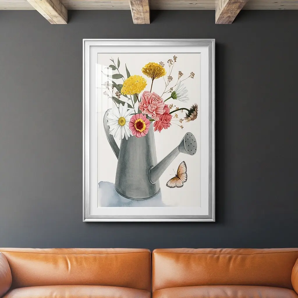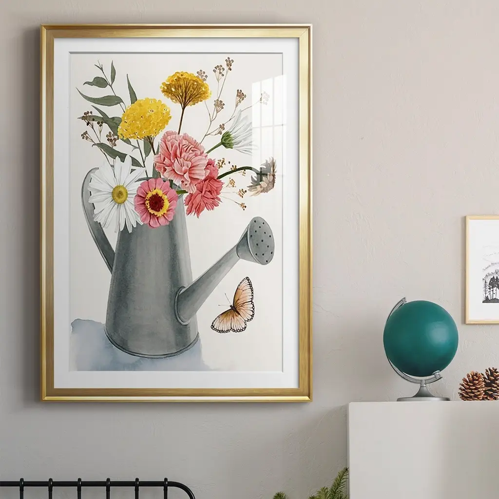 Watering Can Bouquet II Premium Framed Print - Ready to Hang A Premium Framed Print created to last. Framed in distressed wood and available in an array of sizes and colors Featuring a beveled a solid wood stretcher bar, each piece comes ready to hand 4 SIZES AVAILABLE 30.5''X42.5'' - Overall Size 26.5'X36.5'' - Overall Size 22.5''x30.5'' - Overall Size 18.5''x24.5'' - Overall Size Each piece is made to order. Each piece comes with hanging hardware. Made in the USA Ready to Hang Giclee Paper Print Acrylic Glass Beveled Matt Board