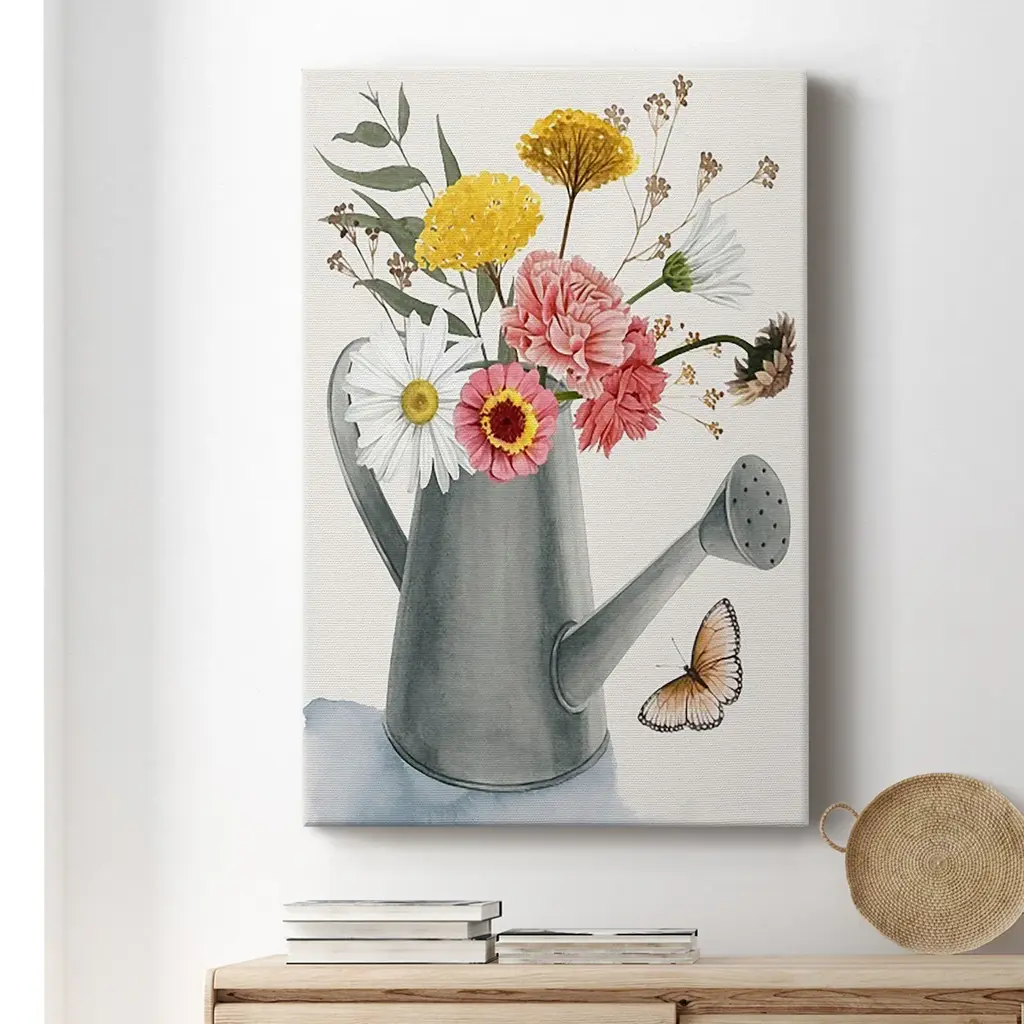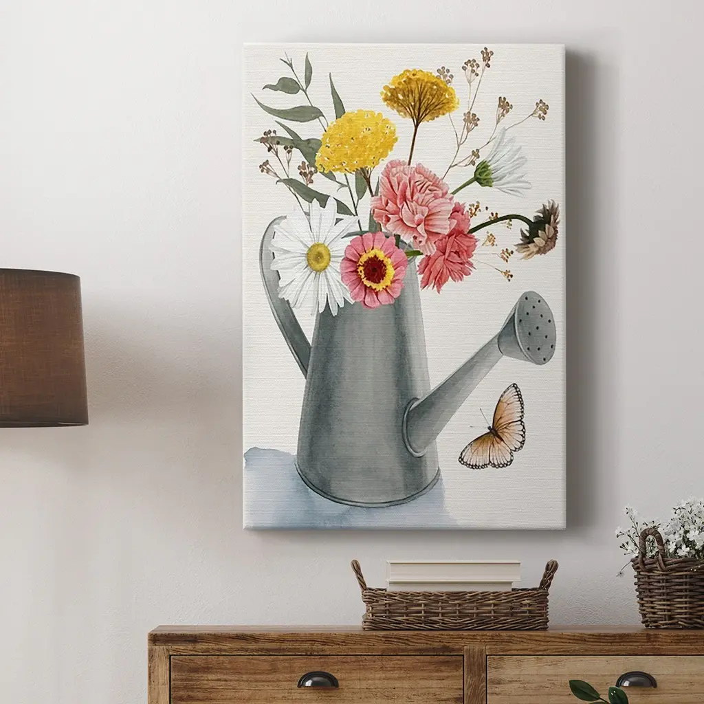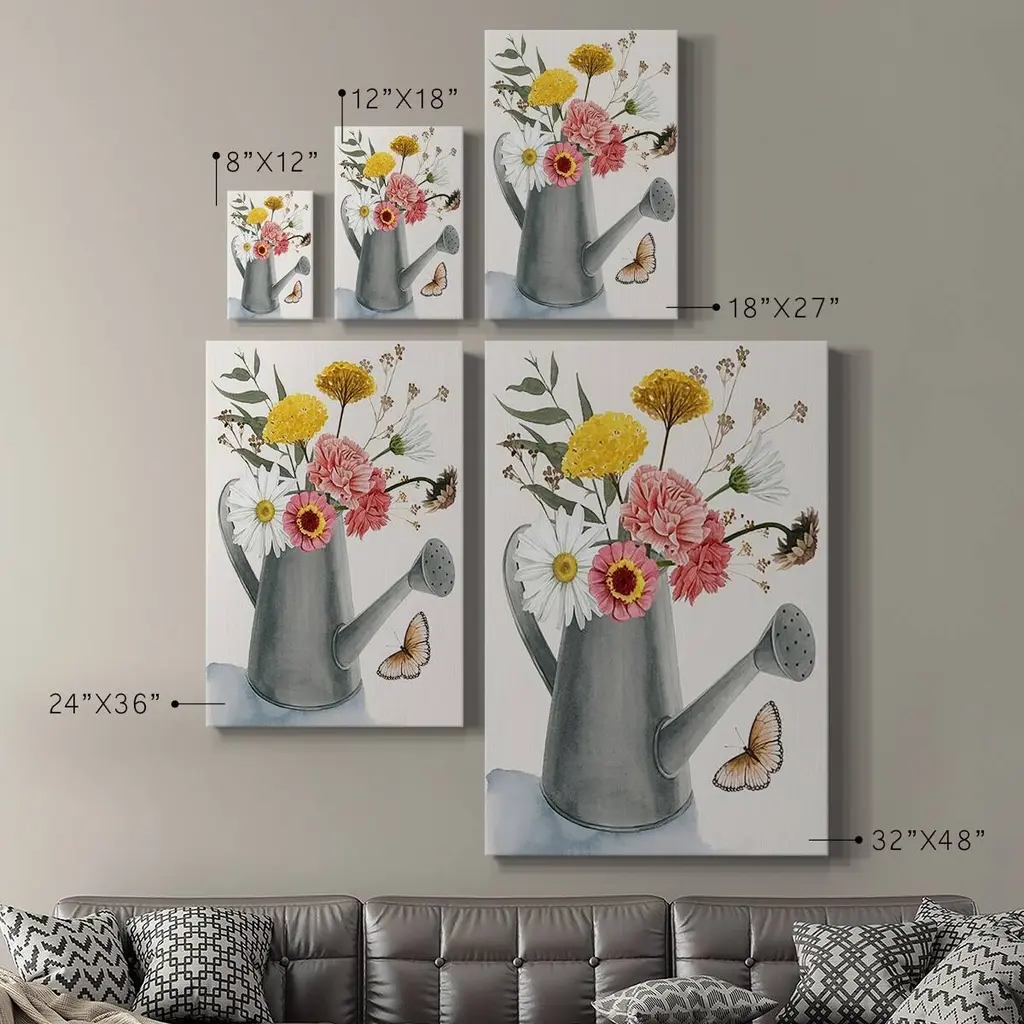 Watering Can Bouquet II Premium Gallery Wrapped Canvas - Ready to Hang A premium hand stretched gallery wrapped canvas print created to last. Featuring a beveled a solid wood stretcher bar, each piece comes ready to hand 6 SIZES AVAILABLE 8''X12'' - Overall Size 12''X18'' - Overall Size 18''X27'' - Overall Size 24''x36'' - Overall Size 32''x48'' - Overall Size 40''x60'' - Overall Size Each piece is made to order. Built to Last Each piece comes ready to hang Solid wood stretcher Fade and Water resistant Made domestically