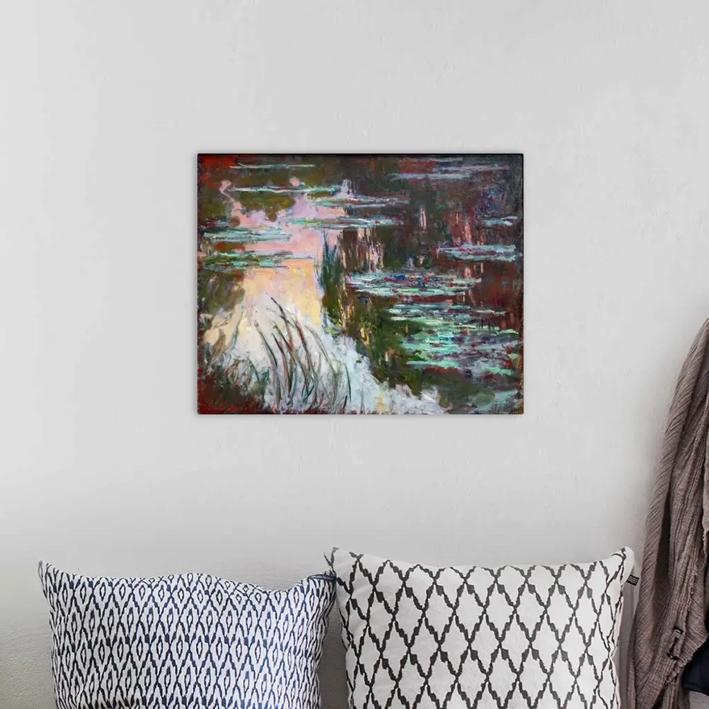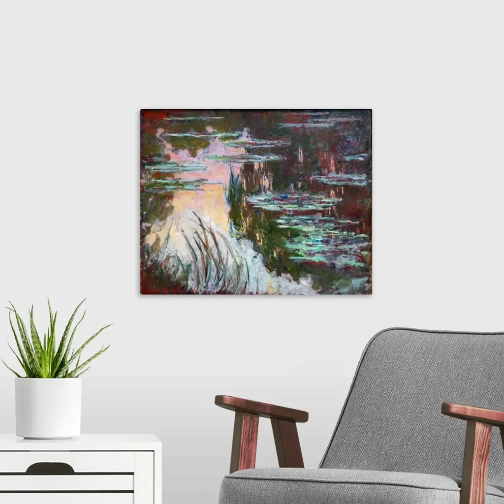 Painting titled 'WaterLilies, Setting Sun' by Claude Monet, founder of French Impressionist painting. Dated 1907.