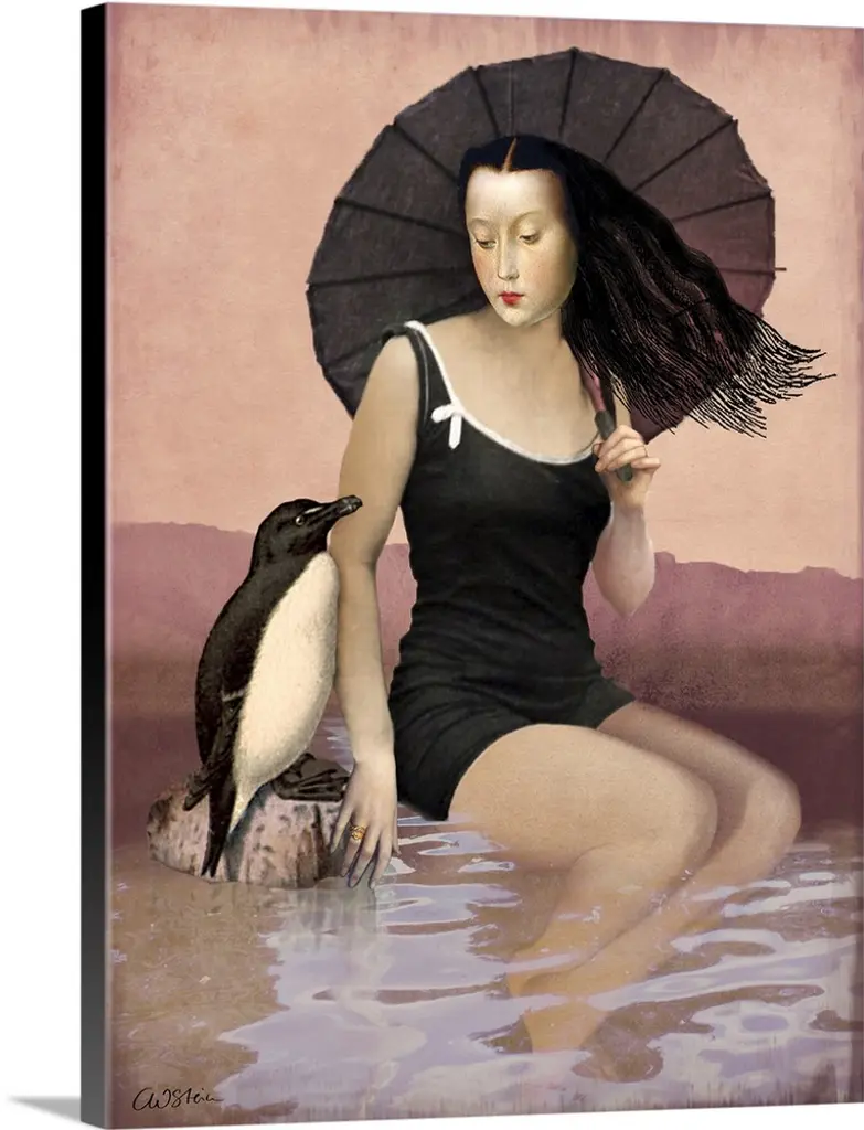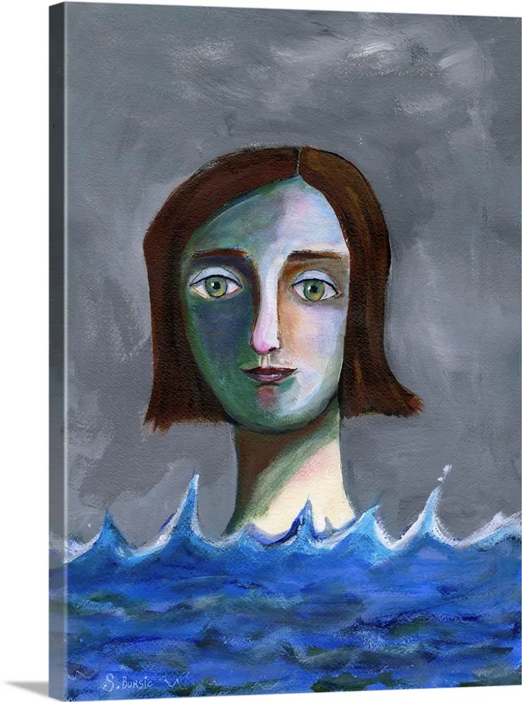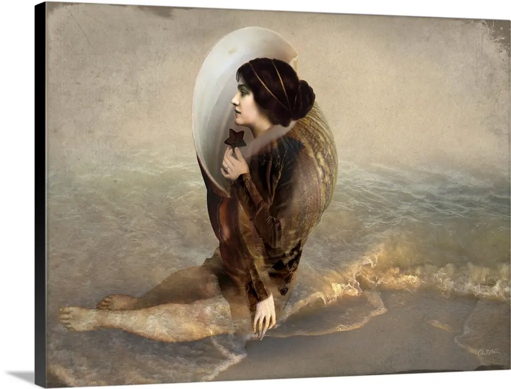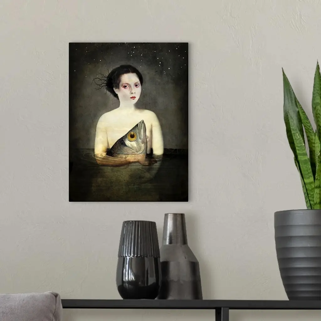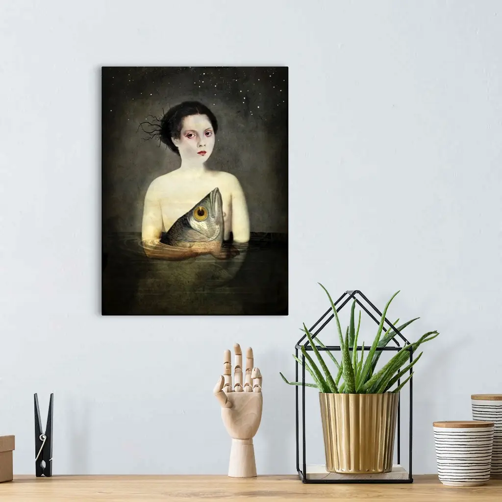 Composite artwork of a female under the stars, holding a large fish while in water.