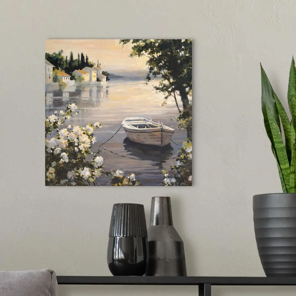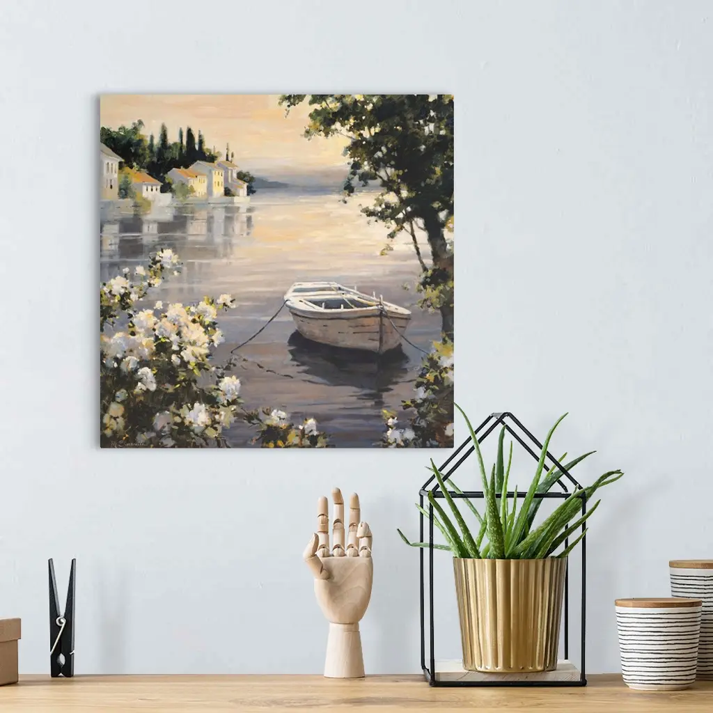 Contemporary painting of a small village harbor, with a white rowboat anchored near the shore.