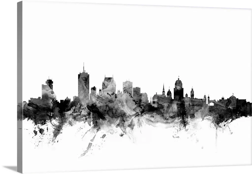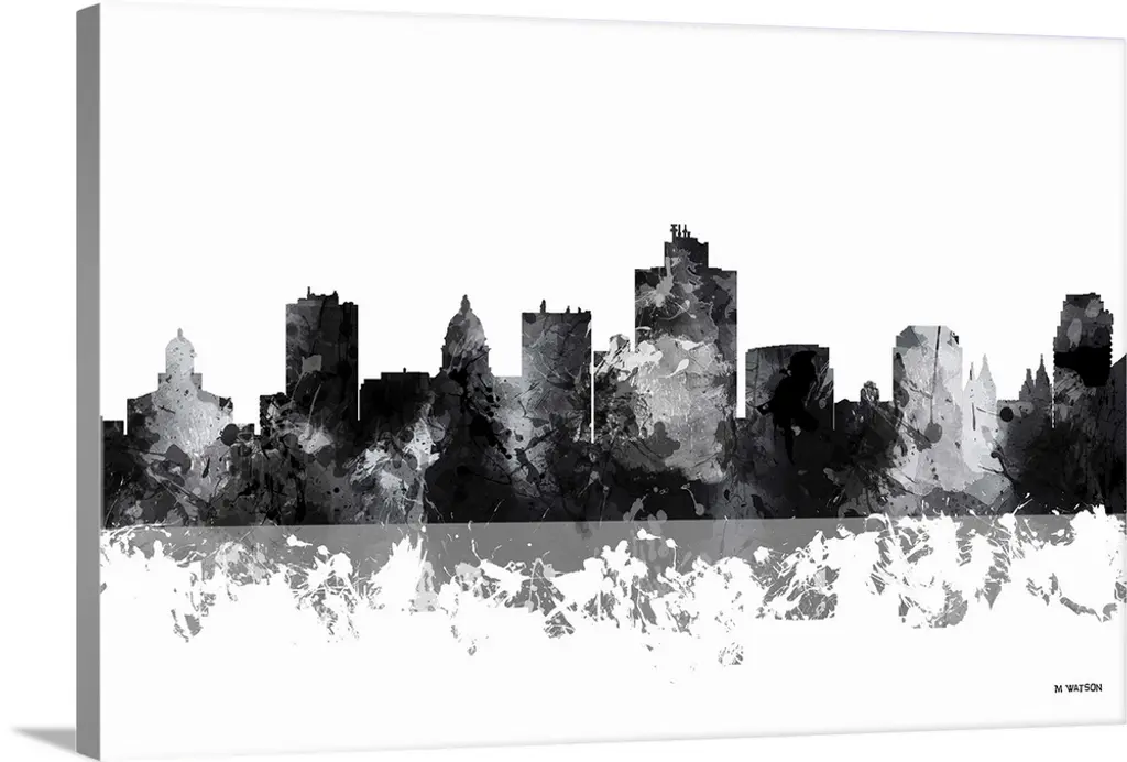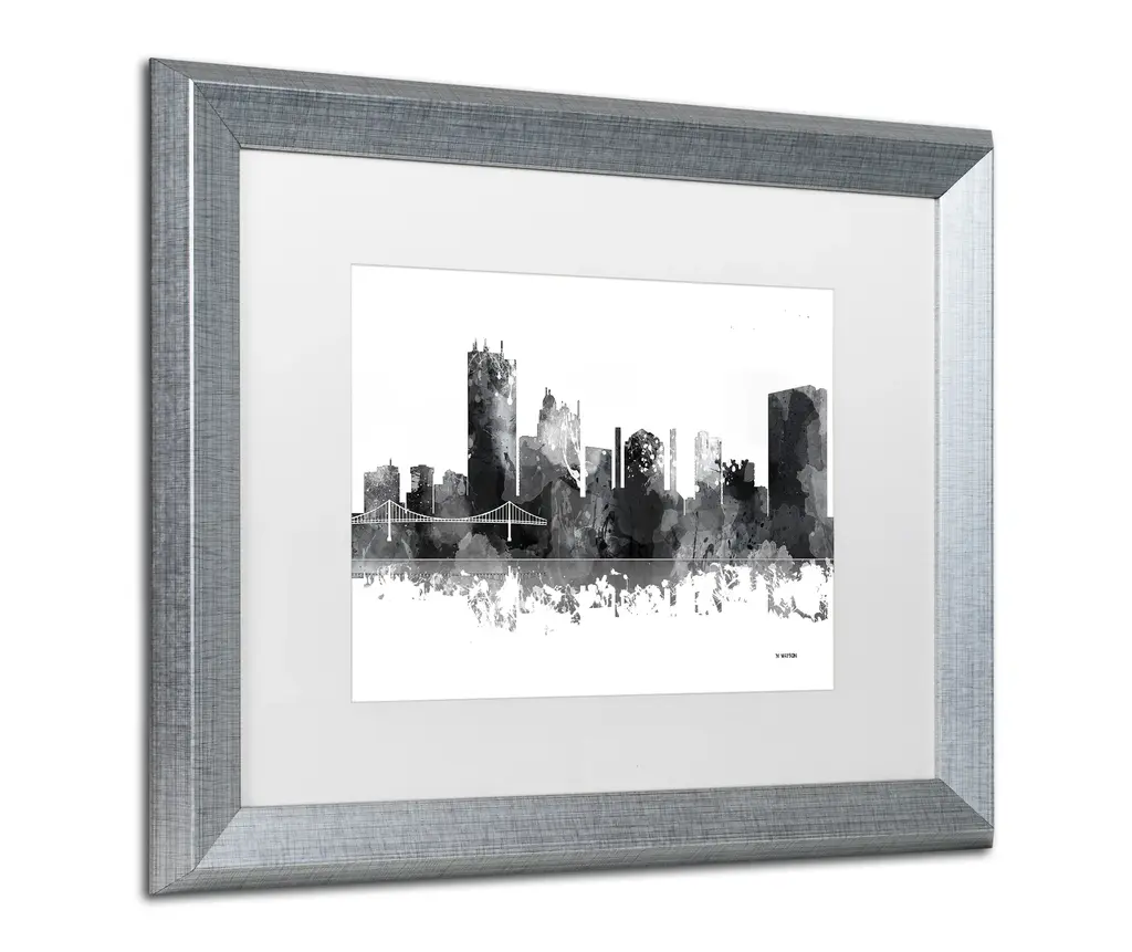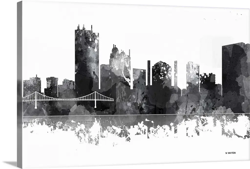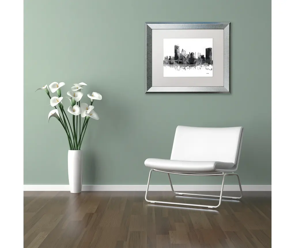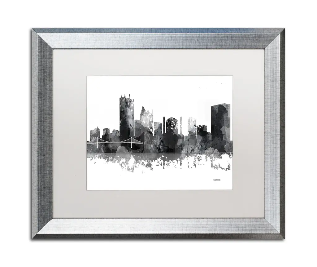 Artist: Marlene WatsonSubject: LandscapesStyle: ContemporaryProduct Type: Silver Frame, White Mat, AcrylicMade in USAThis ready to hang, matted framed art piece features a black and white painted skyline of Toledo, Ohio.Born in Scotland and now residing in Hong Kong, Marlene Watson has been painting her way through life. She paints things she notices in everyday life and brings out her positive energy through her work. Marlene has gallery showings and has also illustrated a children's book. She cares for 12 cats and works toward animal conservation and rescues with her art.An 11x14 giclee print under acrylic in a 16x20 silver frame. Giclee (jee-clay) is an advanced printmaking process for creating museum quality fine art reproductions. This high quality print is matted using antique white matting and comes in a silver frame. A clear acrylic facing is added to protect the print. The piece is fully assembled by professional framers and comes ready to hang. The antique white mat allows the image to really stand out, making it a great addition to any space.