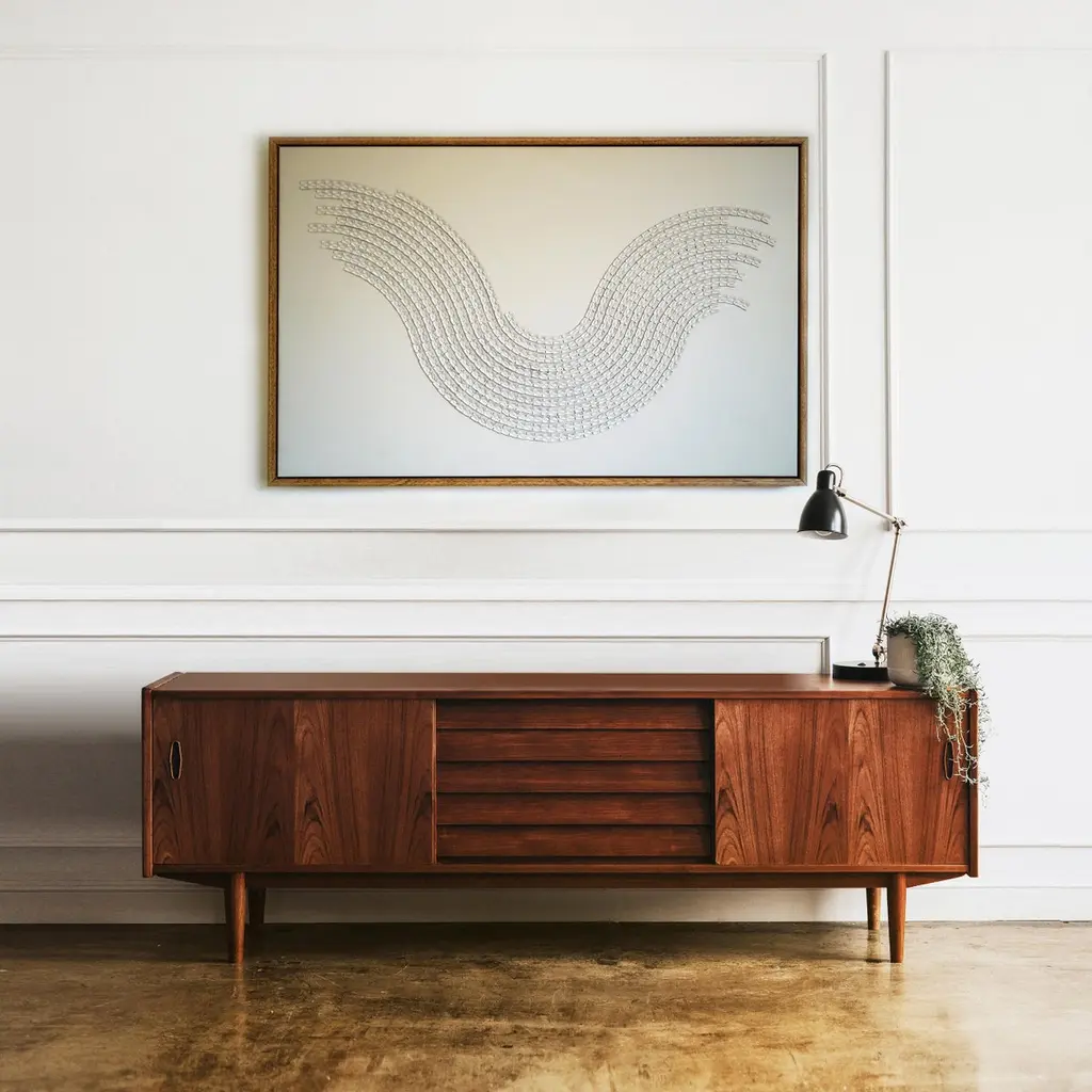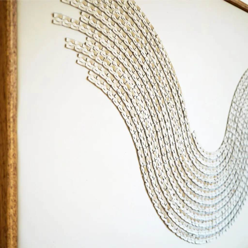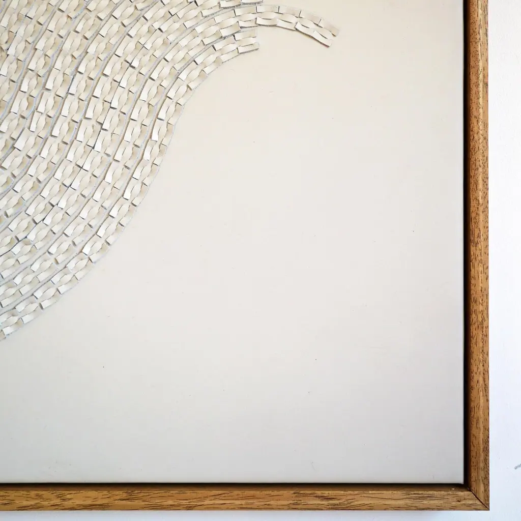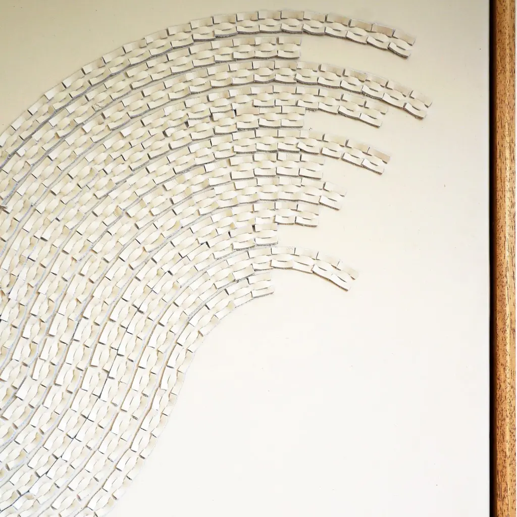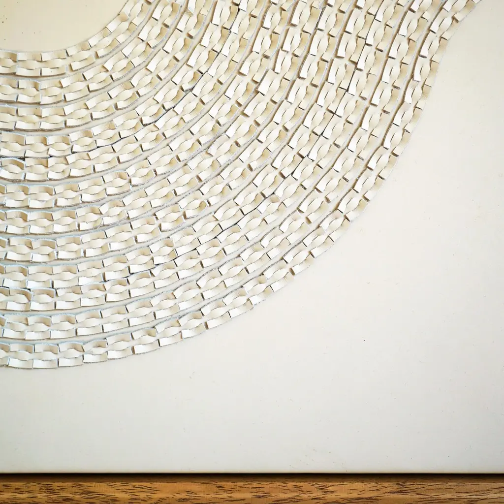Wave:A piece of 3D sculptural wall art designed and made from two layers of cream leather, woven together by Louise Heighes.Measurements are 29 x 45 inches or 114 x 74 cm.This piece has been inspired by basket weaving.I love the way a simple pattern can be created in weaving that from a distance looks pretty uniform, but upon closer inspection each small element of the woven pattern is completely unique and slightly different from its neighbours. .I have recreated this idea using thousands of tiny pieces of leather woven together. Each one slightly different from the next and catching the light in a different way.These artworks are crafted from two layers of sustainably sourced leather meticulously cut and intricately woven together, creating a rich sculptural surface. When installed the 3D nature of the work creates beautiful shadows that add an extra depth to the work.I have always been inspired by the flow and movement which I see in the natural world. Be it a field of wild flowers or the blossom on a tree, I have always loved the way the shape of a single petal or flower can be repeated over again, creating myriad of ever changing new patterns. The importance of simplicity, craftsmanship and creating something by hand is key to what I do.