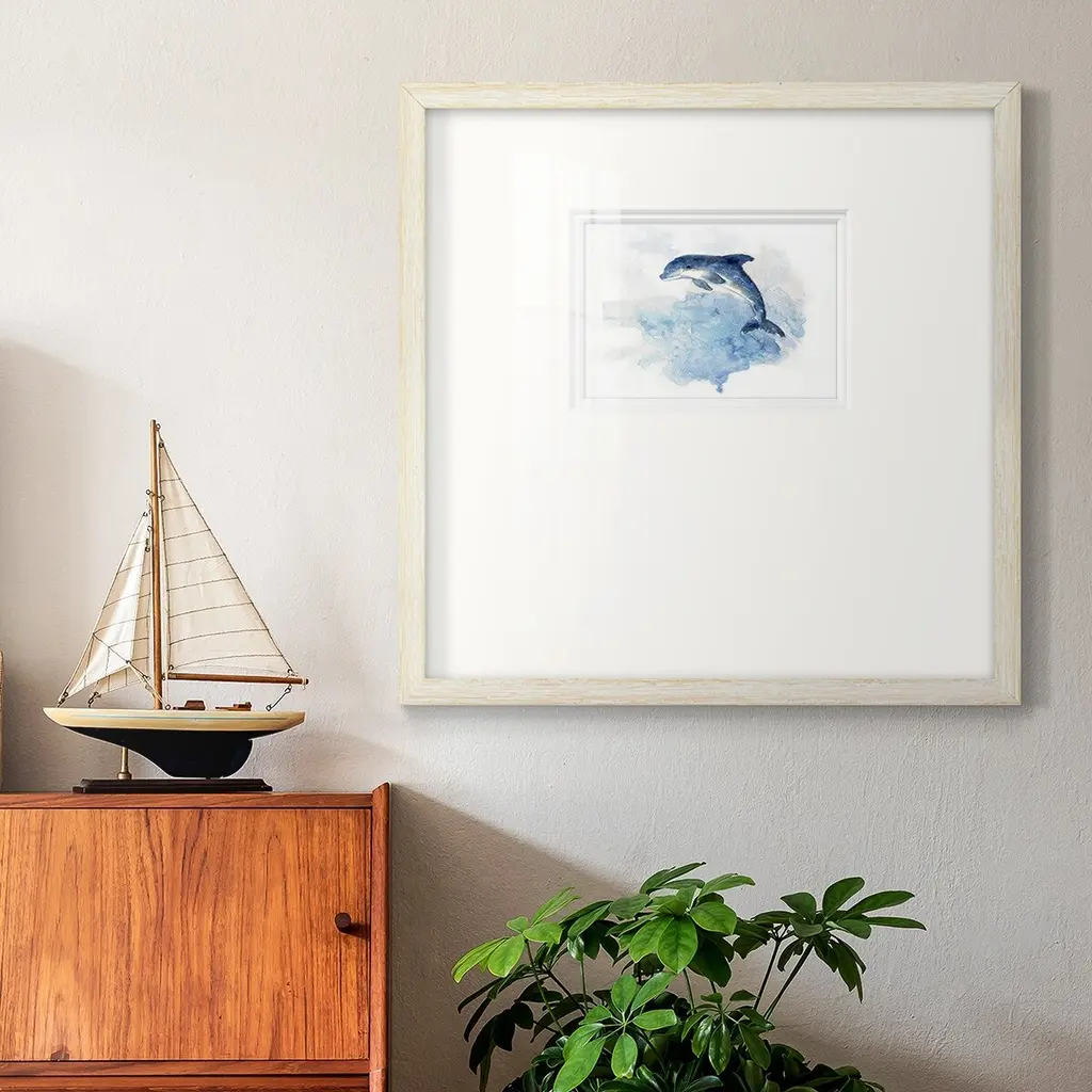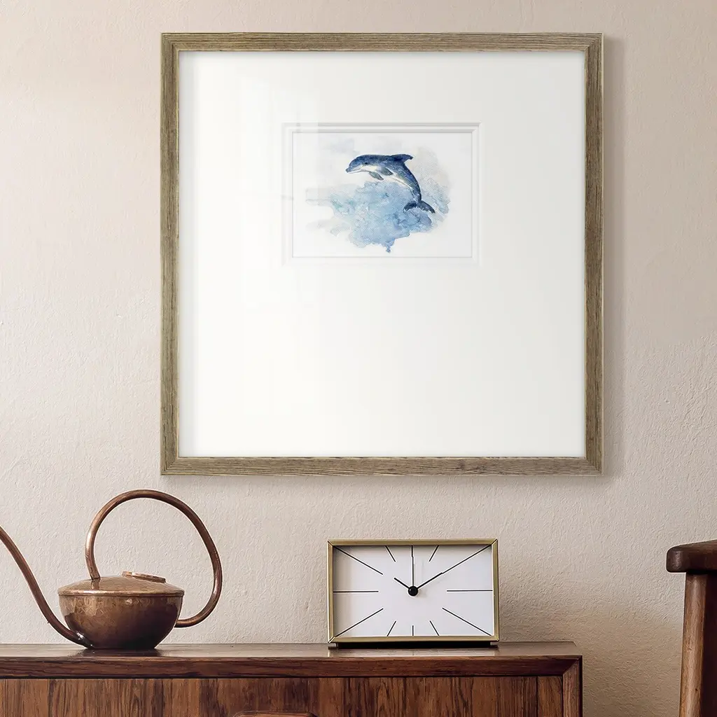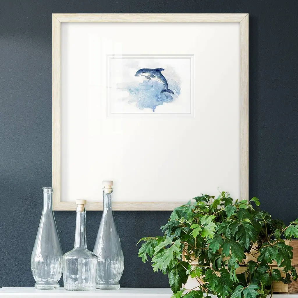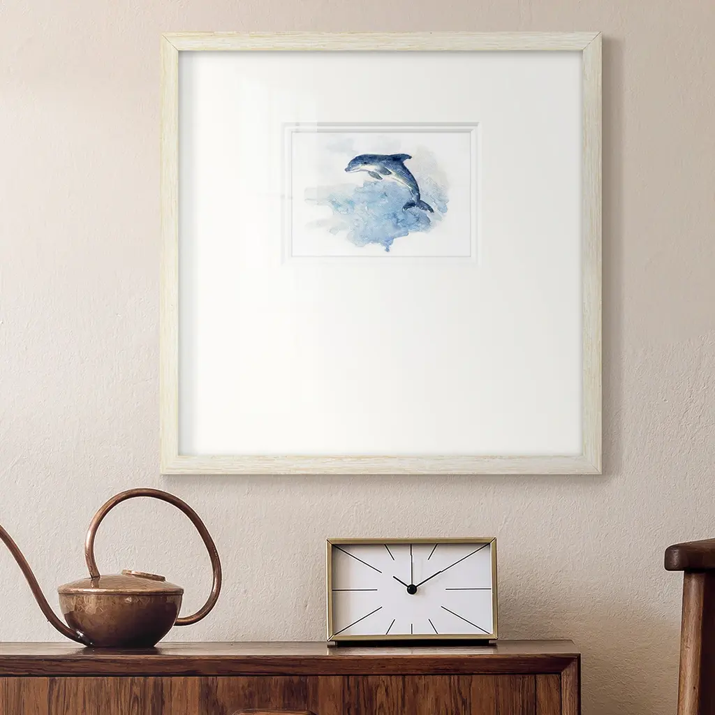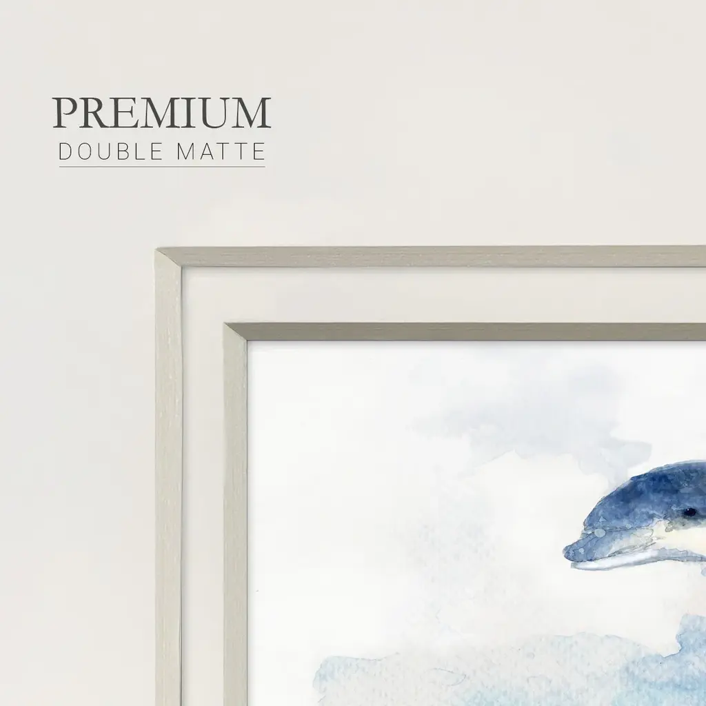 Wave JumpingPremium Framed Print A framed cold pressed paper print featuring superior double matting and quality frame. 2 SIZES AVAILABLE 16''X16''' - Overall Size 20''X20''' - Overall Size Each piece is made to order. Each piece comes with hanging hardware. Made in the USA Ready to Hang Giclee Paper Print Plexiglass Beveled Matt Board Double Matte Board
