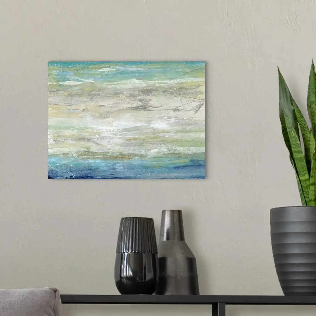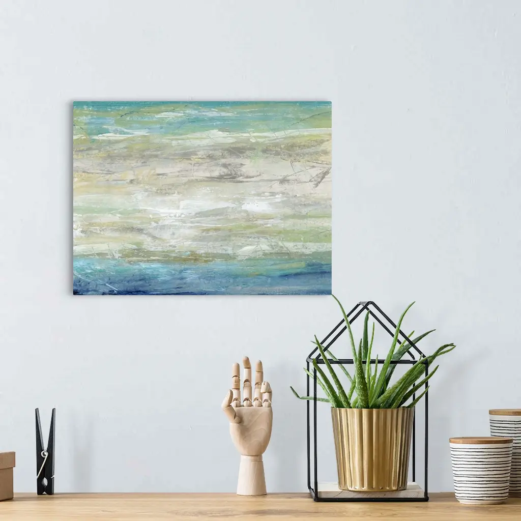 This abstract artwork expresses the turmoil of waves on the ocean by using a ranges of blues and tans in energetic brush strokes.