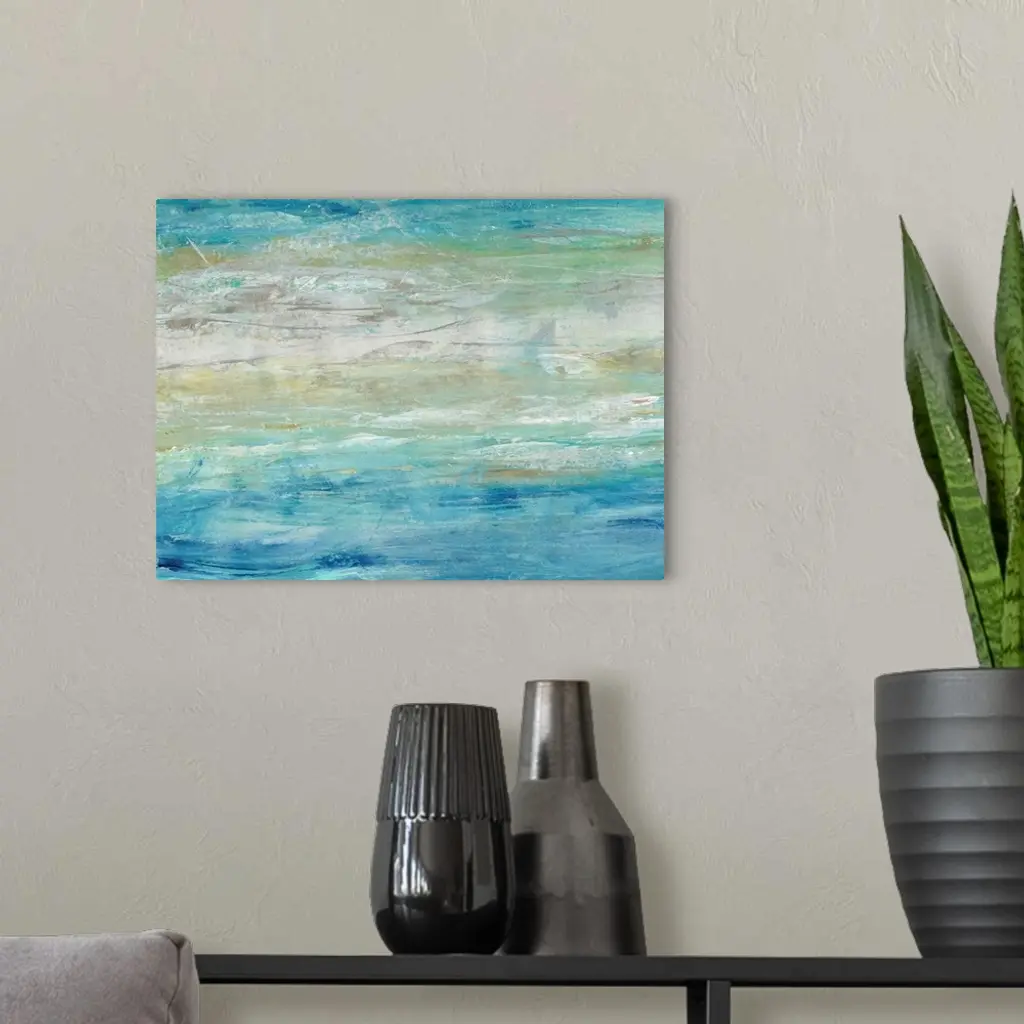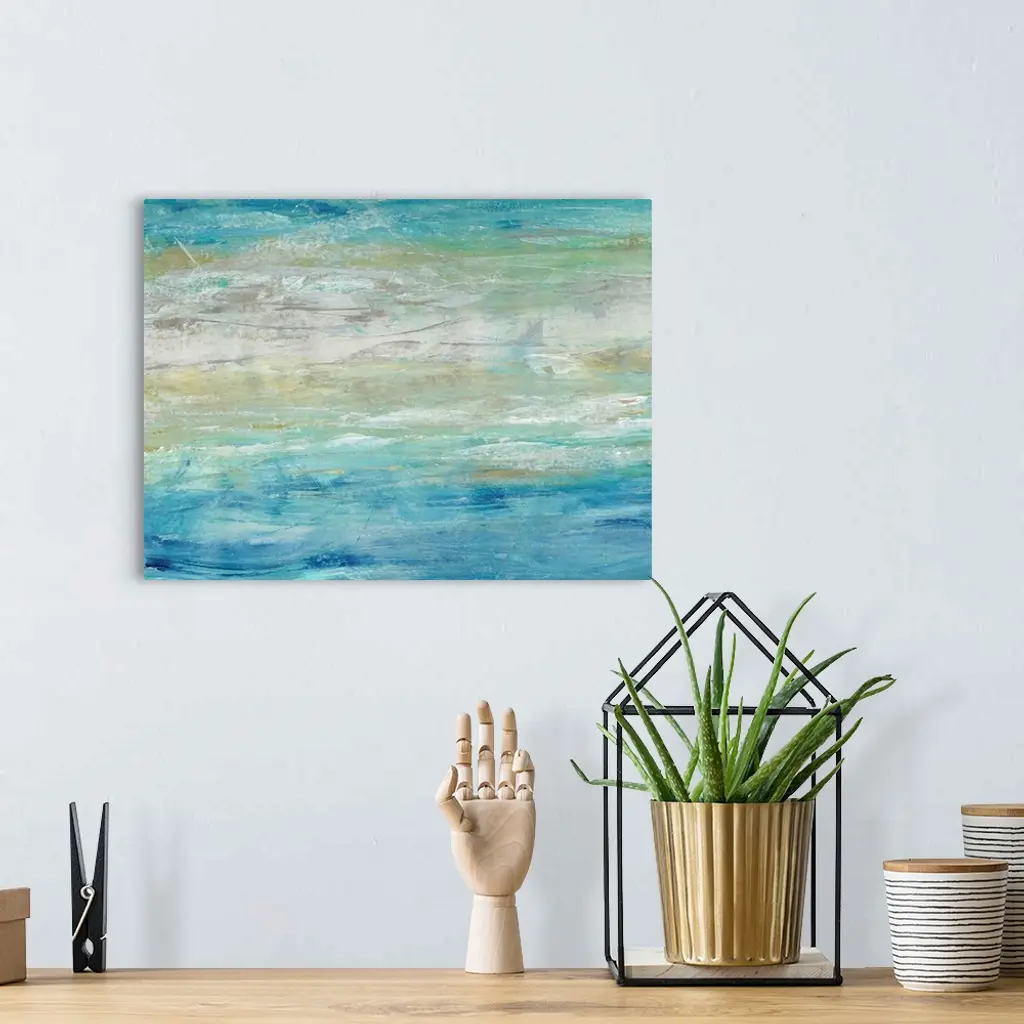 This abstract artwork expresses the turmoil of waves on the ocean by using a ranges of blues and tans in energetic brush strokes.