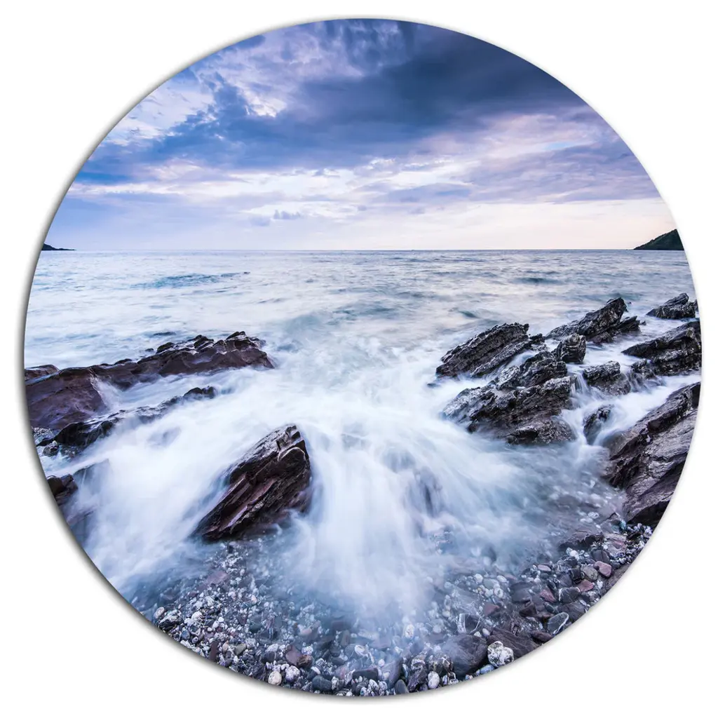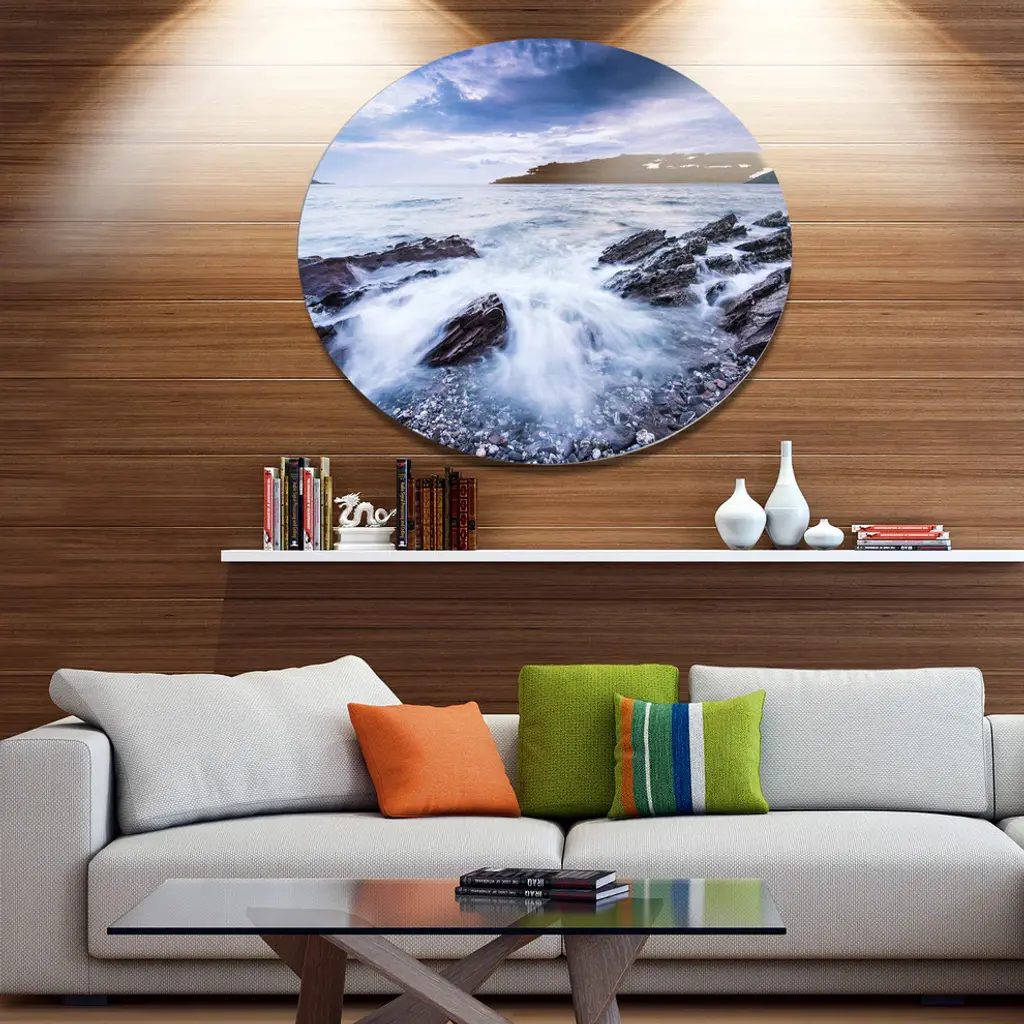 Bring Contemporary Abstraction to your home with this large Circle Metal wall art. This Waves Crashing At Beach Metal Artwork makes it the focal point of any room or office. - White Gloss Coating ensures colors are extra vibrant with light reflection.- Aluminum grade Sheet Metal with 1 inch mounting frame on the back giving the illusion that the artwork is floating on the wall..- Mounting Brackets are included along with instructions.- High Quality Digital images are created directly into a glossy aluminum panel producing a stunning and captivating print into the glossy finish of the metal.- Water, Fire and Scratch resistant HD Aluminum panels.- Looks better than any photo paper and guaranteed to last at least 20 years- Easy to clean with a microfiber cloth. Colors are far superior to regular Canvas Art. - Easy to Hang