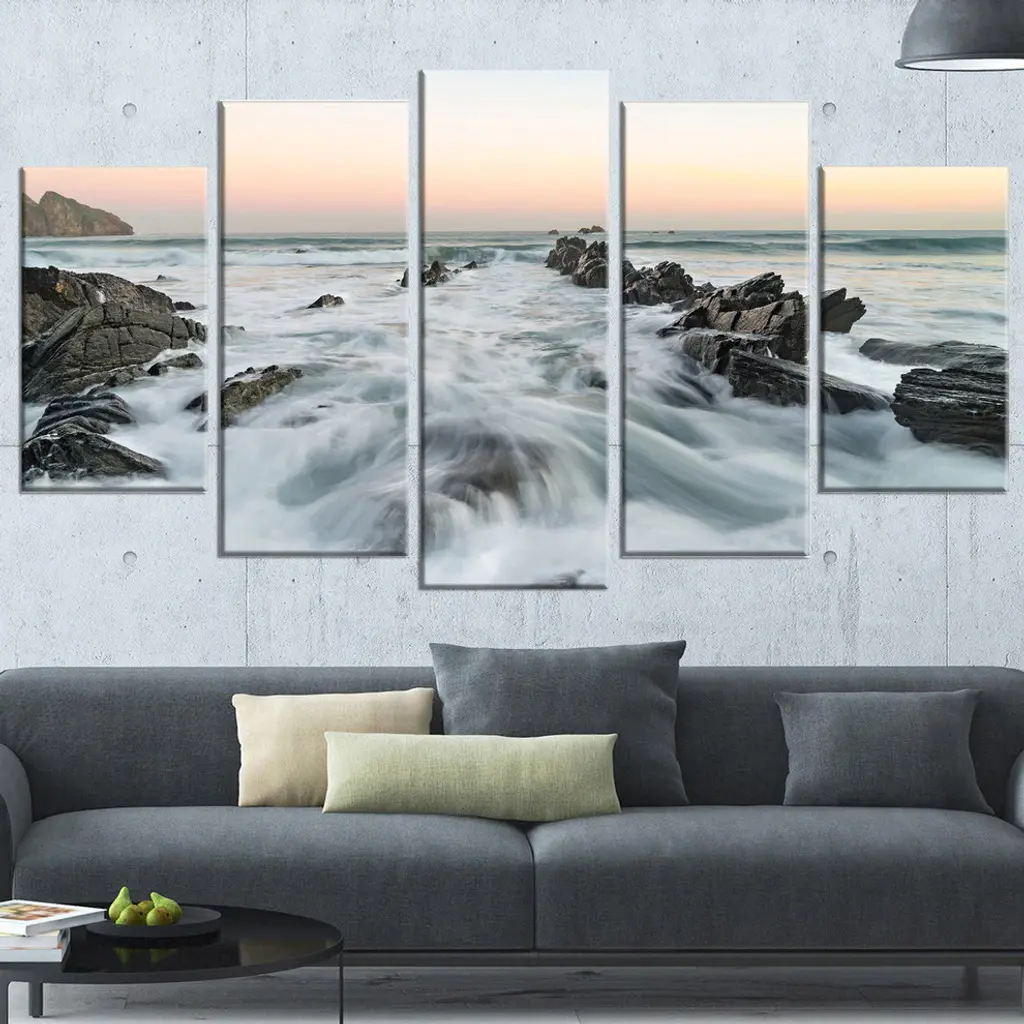 "Waves Hitting Beach At Sunrise Atlantic" Seascape Wall Art, 5 Panels, 60"x32"