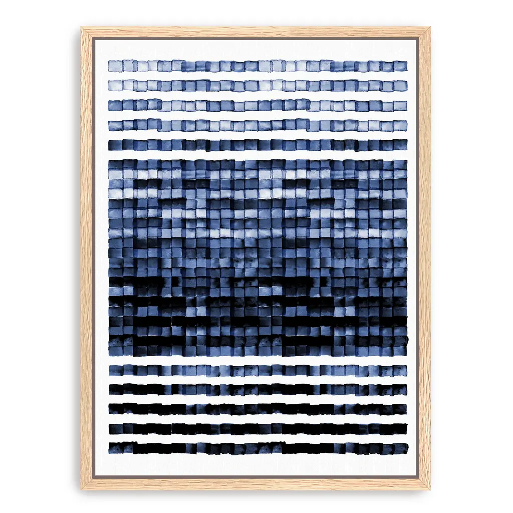 Elevate your decor with this stunning "Indigo Blocks" blue abstract pattern canvas art by Danushka Abeygoda. Featuring a dynamic interplay of various blue tones, this artwork adds a touch of modern sophistication to any space. The intricate patterns and fluid lines create a captivating visual experience, making it an ideal centerpiece for both contemporary and classic interiors. Available in black frame, dark walnut frame, oak frame, or as a wrapped canvas. Our Gallery Wrap Canvas Prints are proudly assembled with high quality materials in California, USA. Each piece is printed on a thick, archival grade canvas using Giclee technology. It is then hand-stretched by our experienced artisans over solid wood bars, which will not warp over time. The final product is a piece personally crafted for you to confidently display on your wall. Care and Assembly: Ensure that the location of your piece has little to no exposure to heat, sunlight, and moisture. Wipe clean, only if needed. Each piece includes a sawtooth hanger to hang on your wall horizontally.