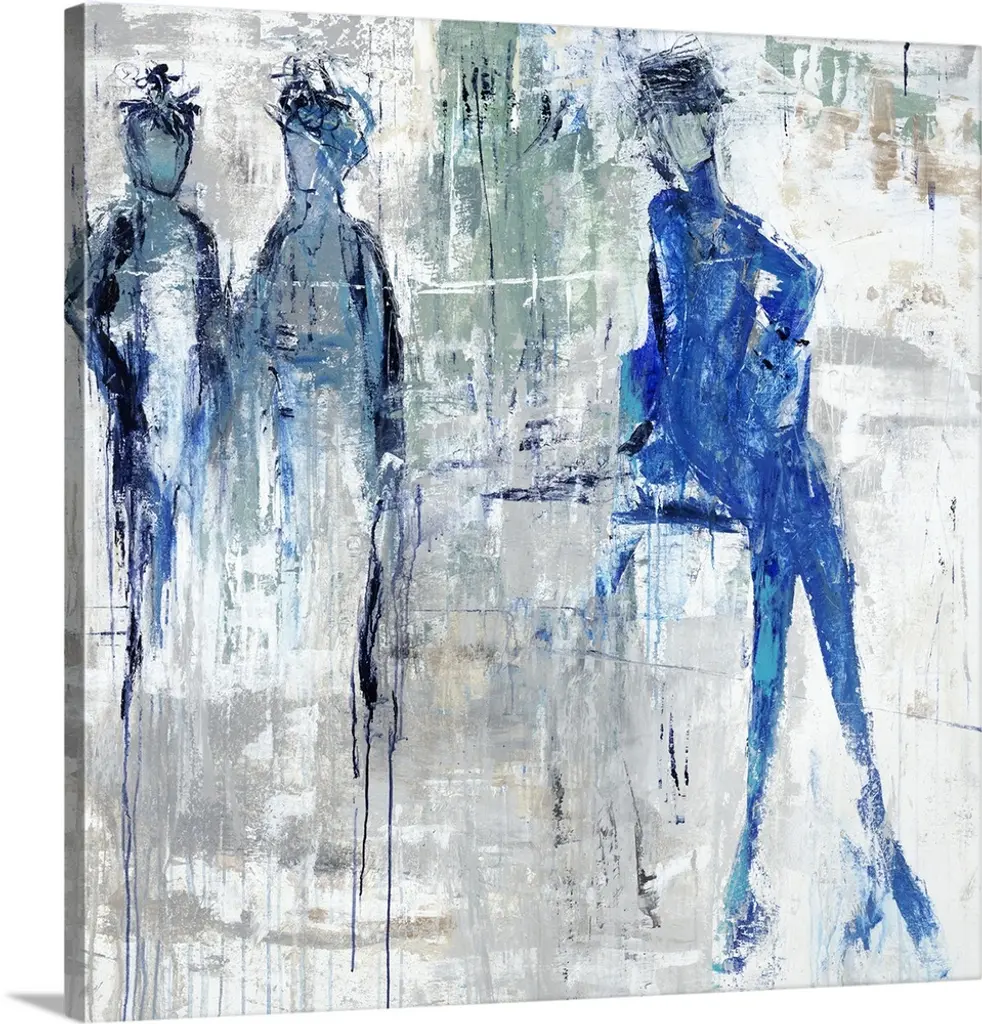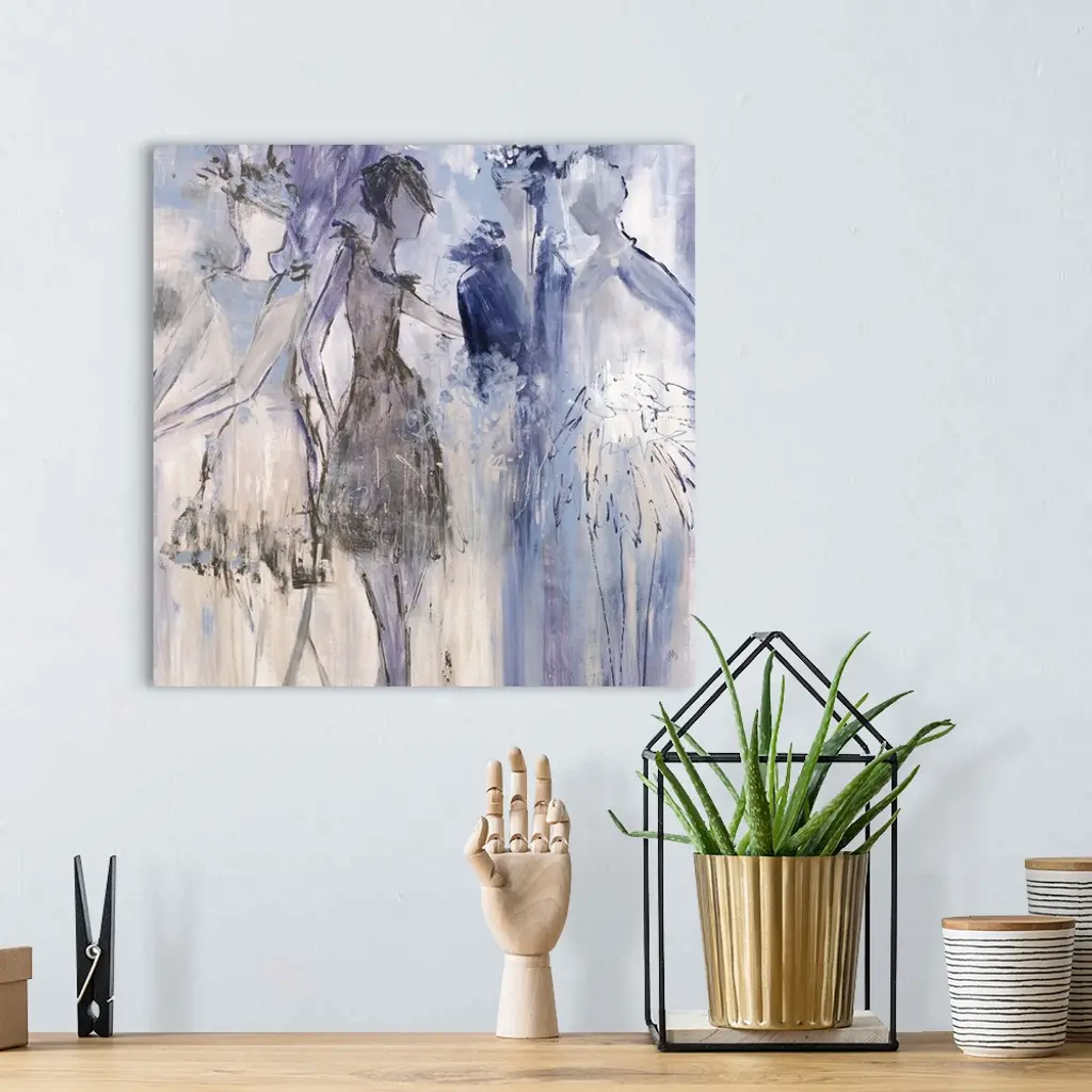Contemporary artwork of several female figures in dresses in shades of blue and purple.